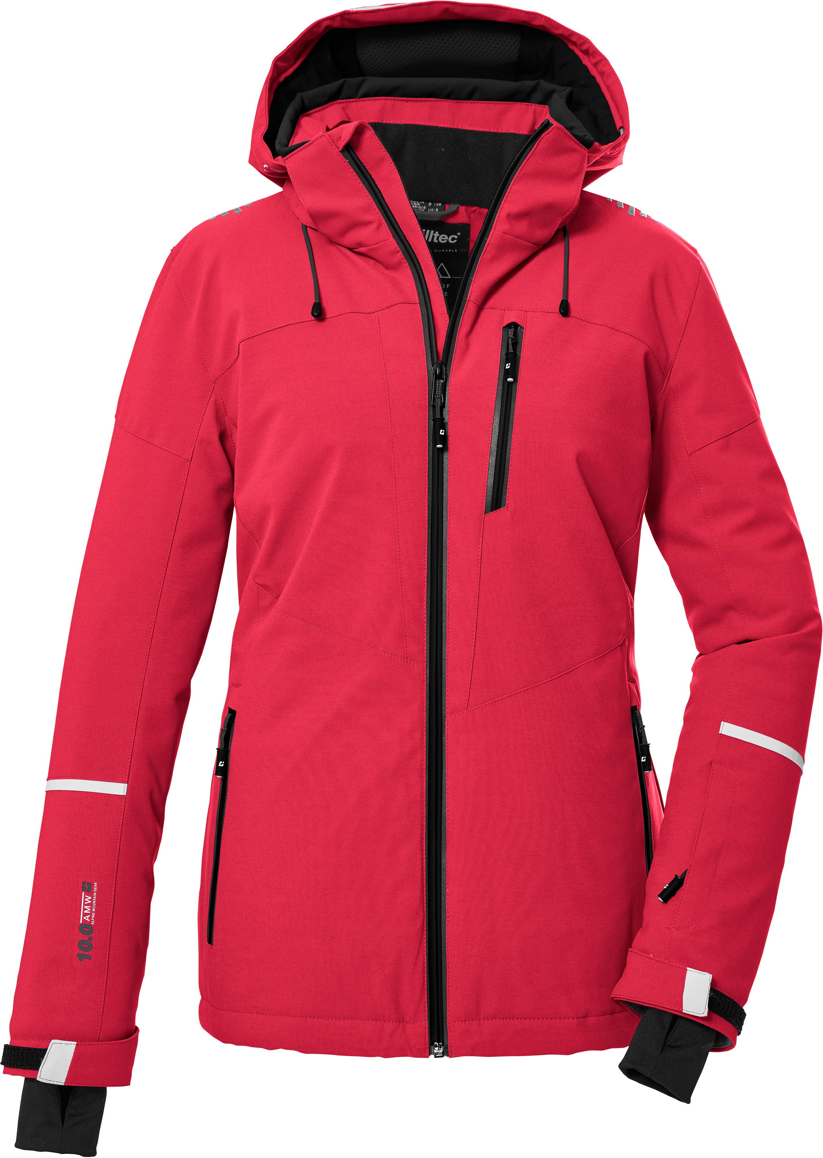 Funktionsjacke für winterliche Outdoor-Aktivitäten; wasserdicht und atmungsaktiv; Wassersäule: 10.000 mm; mit versiegelten Nähten; abnehmbare Kapuze mit Kordelzug; Frontreißverschluss mit Kinnschutz; Brusttasche, 2 Seitentaschen und Liftpasstasche mit Reißverschluss; Schneefang verhindert das Eindringen von Schnee und Wind; verstellbare Armabschlüsse mit Klettriegeln und Innenbündchen mit Daumenlöchern; ohne PFC hergestellt; Material 100% Polyester.
