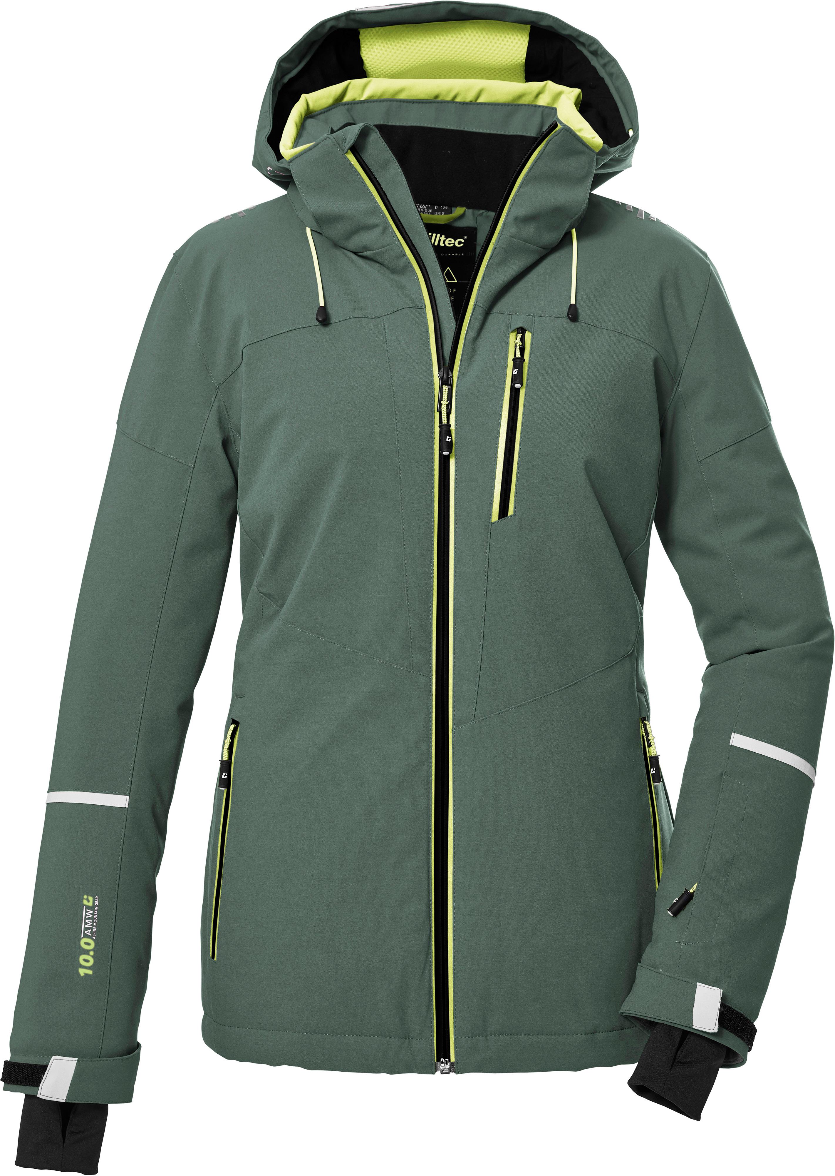 Funktionsjacke für winterliche Outdoor-Aktivitäten; wasserdicht und atmungsaktiv; Wassersäule: 10.000 mm; mit versiegelten Nähten; abnehmbare Kapuze mit Kordelzug; Frontreißverschluss mit Kinnschutz; Brusttasche, 2 Seitentaschen und Liftpasstasche mit Reißverschluss; Schneefang verhindert das Eindringen von Schnee und Wind; verstellbare Armabschlüsse mit Klettriegeln und Innenbündchen mit Daumenlöchern; ohne PFC hergestellt; Material 100% Polyester.