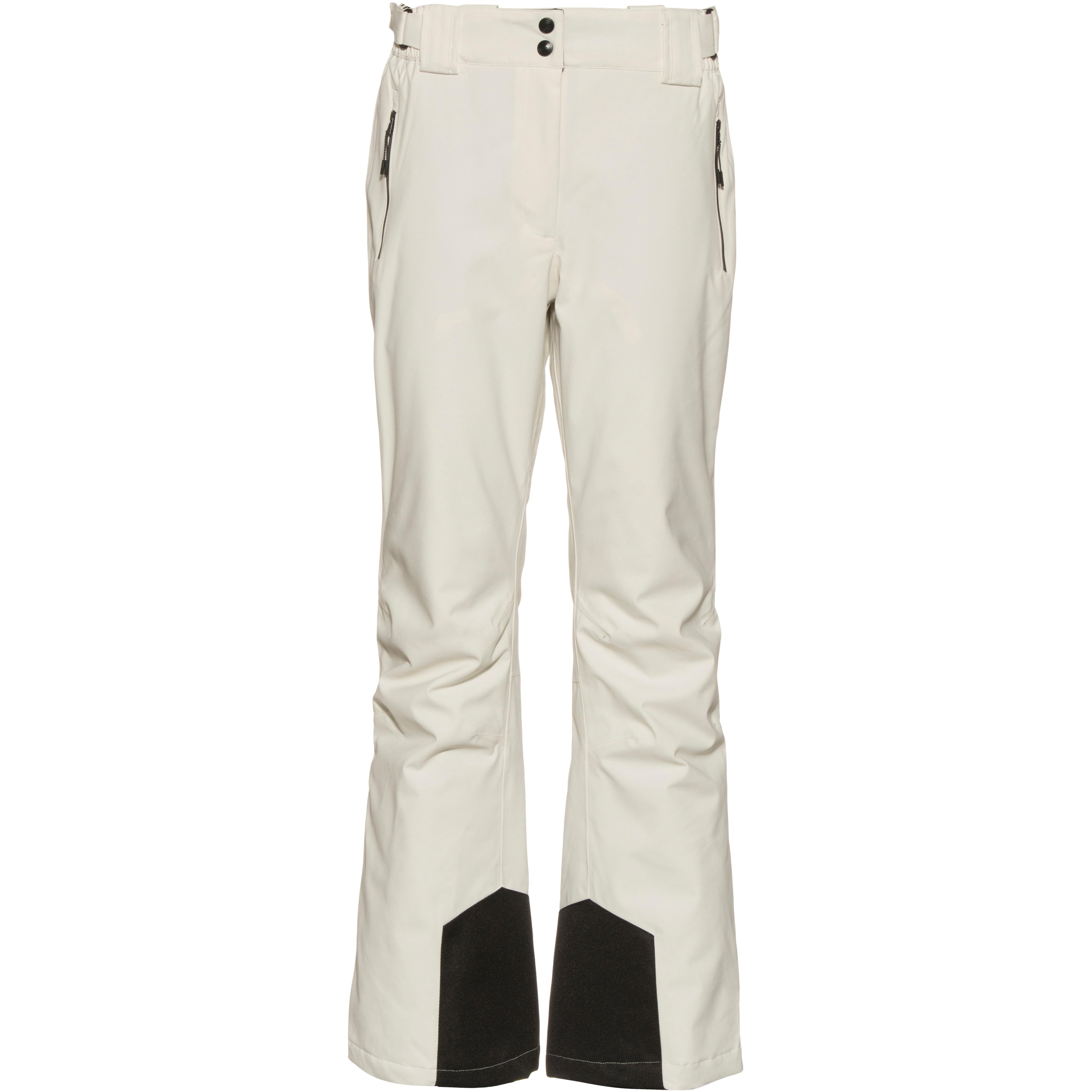 Skihose mit abnehmbaren Hosenträgern und Schneefang; 100% wind- und wasserdicht dank verschweißter Nähte; atmungsaktiv und feuchtigkeitsableitend; 4-Wege-Stretch-Material; ohne PFC hergestellt; weitenregulierbarer Taillenbund; Gürtelschlaufen; Reißverschluss und Druckknopfverschluss; seitliche Eingrifftaschen mit Reißverschluss; Kantenschutz und Reißverschlüsse an den Beinabschlüssen; figurbetonte Passform; Wassersäule: 10.000 mm; Material I 100% Polyester; Material II 96% Polyester, 4% Elastan.