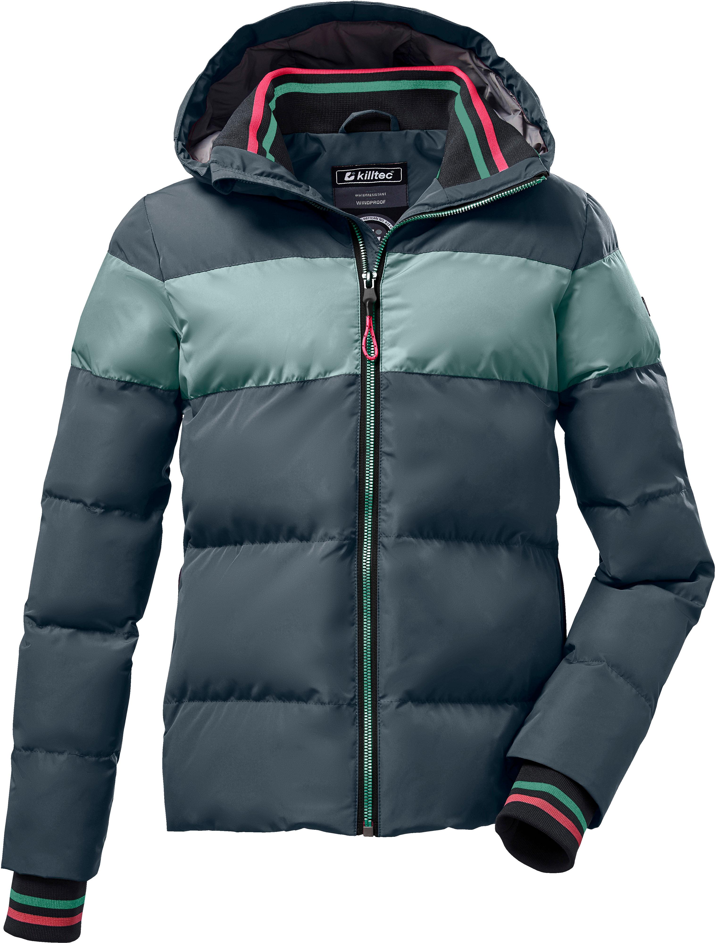 Wattierte und gesteppte Jacke mit fester Kapuze; Kinnschutz am Kragen; unterlegter, durchgehender Reißverschluss; 2 Reißverschlusstaschen; Ärmelabschlüsse mit Cuffs aus Rippbündchen; mit Taffeta gefüttert; PU-Laminat; Wassersäule 10.000 mm; wasserabweisend; ohne PFC hergestellte Imprägnierung; Material 100% Polyester.