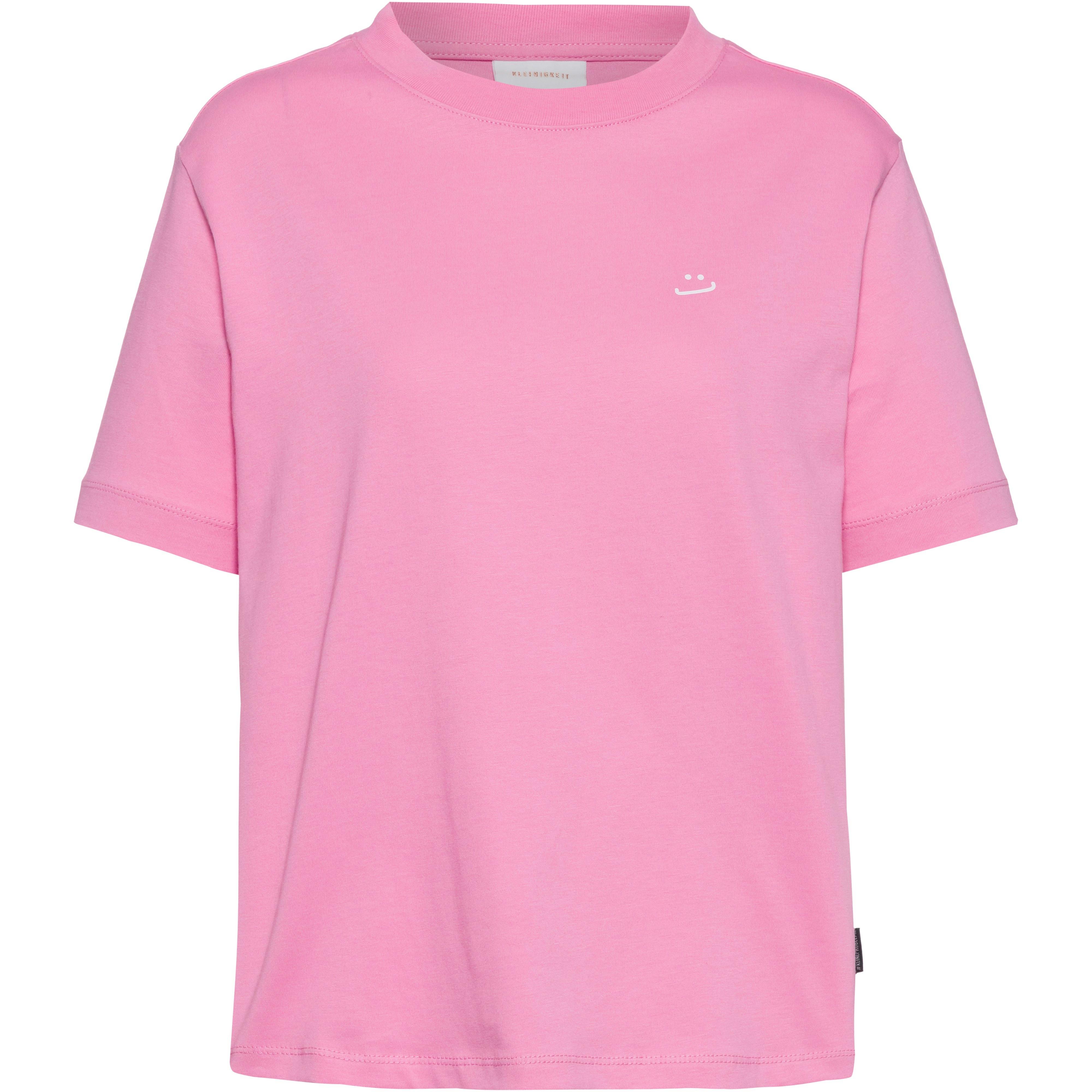 Einfarbiges T-Shirt mit kleinem Smiley auf der Vorderseite; gerippter Rundhalsausschnitt mit Nackenband; leicht überschnittene Schultern; lockere Passform; Material 100% Baumwolle.