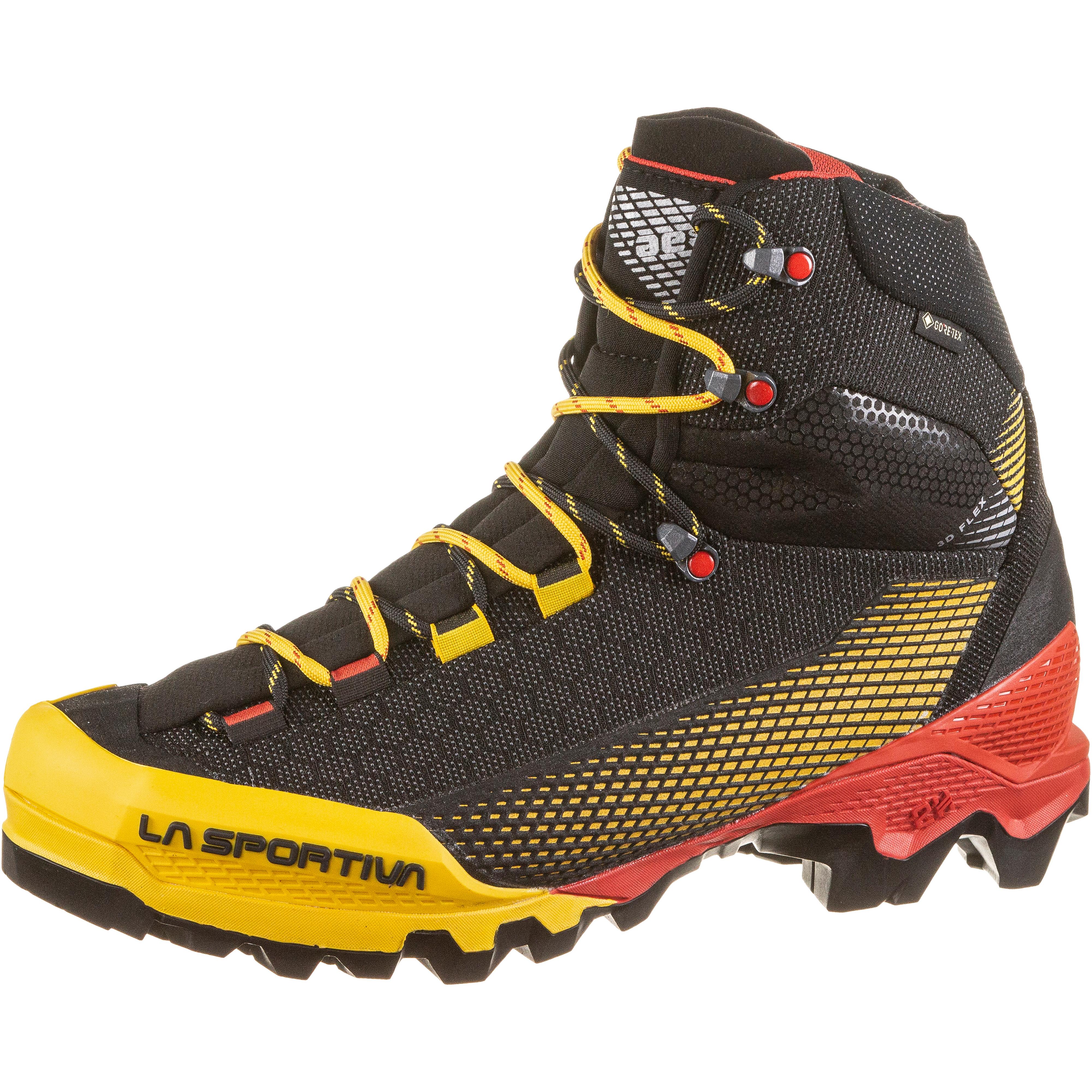 Bedingt steigeisenfeste Alpine Bergschuhe für das schnelle Bergsteigen auf wechselndem Terrain und für de Einsatz in mittleren Höhen geeignet; dauerhaft wasser- und winddicht sowie atmungsaktiv dank GORE-TEX Membran; die weit nach vorn reichende Schnürung mit seitlichen Zuglaschen und Metallhaken im Schaftbereich, sorgen für eine optimal personalisierbare Anpassung an den Fuß; fester Geröllschutz im Zehenbereich; schützende Fersenkappe; gepolsterter Schaft; dämpfende PU-Zwischensohle; extrem abriebfeste sowie grobstolliger Vibram®-Außensohle, mit Impact Brake System und Climbing Zone; herausnehmbare Einlegesohle; Gewicht: ca. 1460 g/Gr. 43 (Paar).