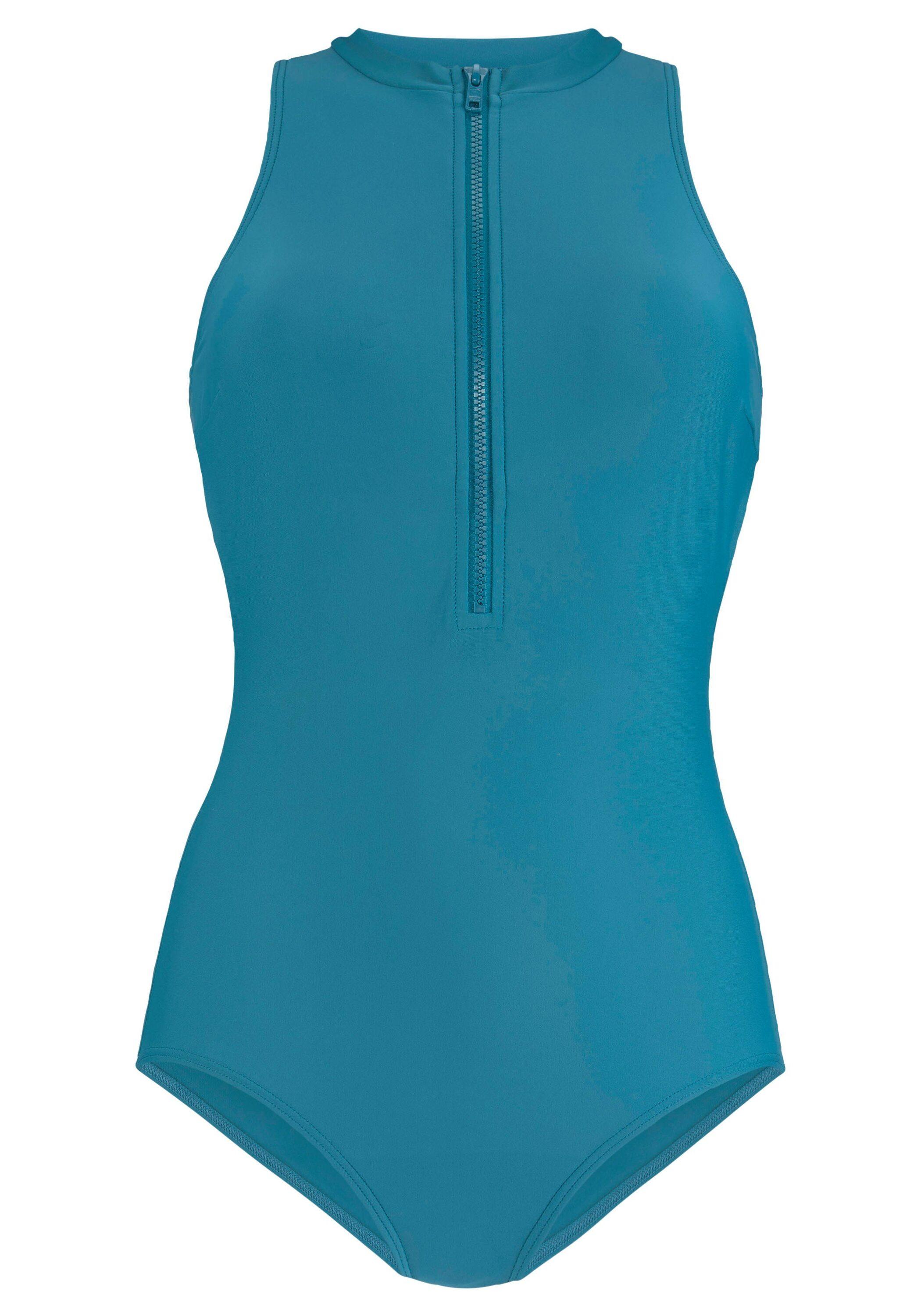 Sportiver Badeanzug von Lascana Active. Für ein schönes Dekolleté: herausnehmbare Softcups und Unterbrustgummi. Rücken im Racerback-Design. Hoher Halsausschnitt mit Reißverschluss. Elastisches Material.