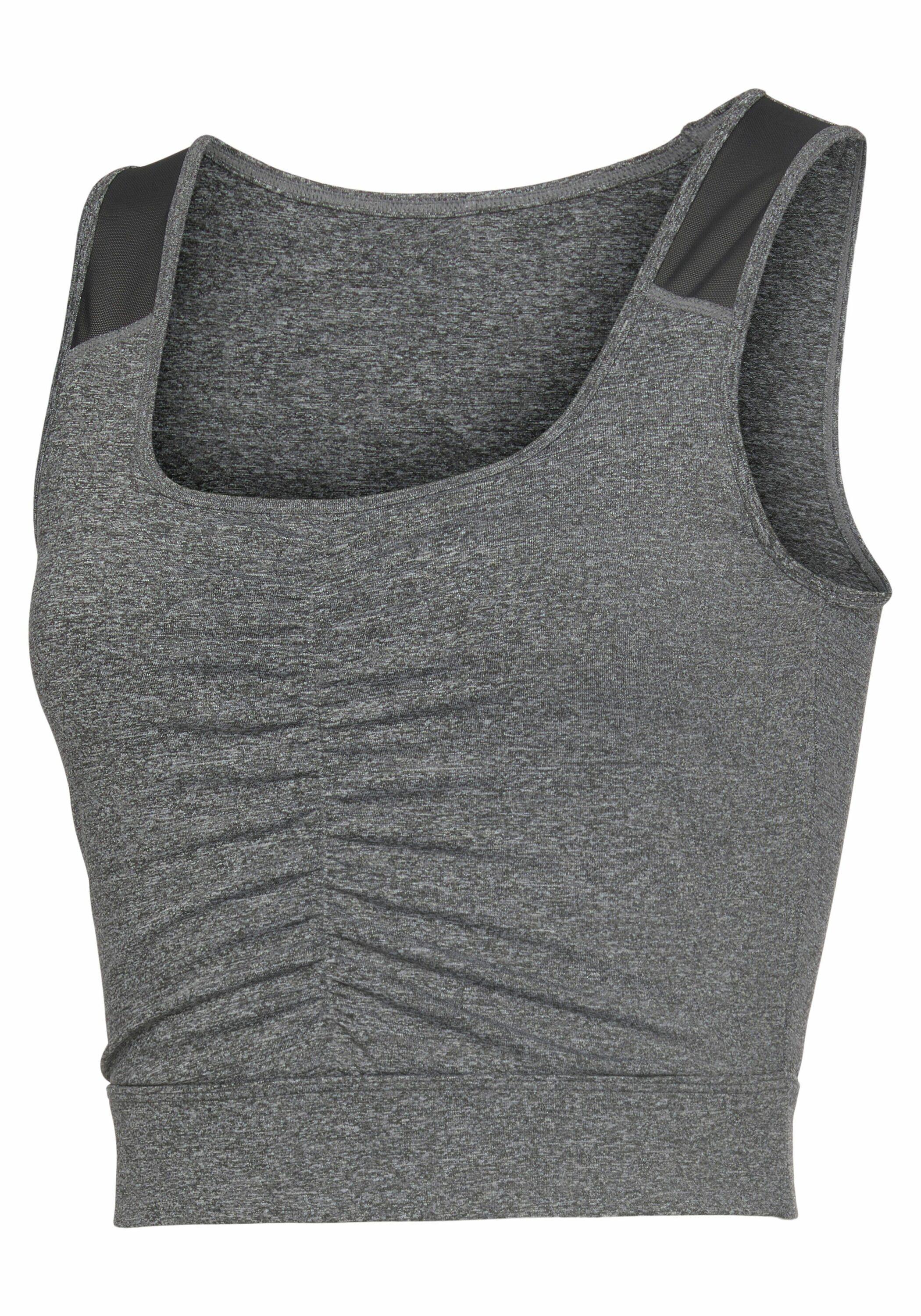 Lascana Active Cropped-Top, attraktiv gerafftes Vorderteil, abgesetzter breiter Bund, eingefasster tiefer Rundhalsausschnitt, sportliche Mesh-Einsätze an den Trägern, aus atmungsaktiver Qualität.