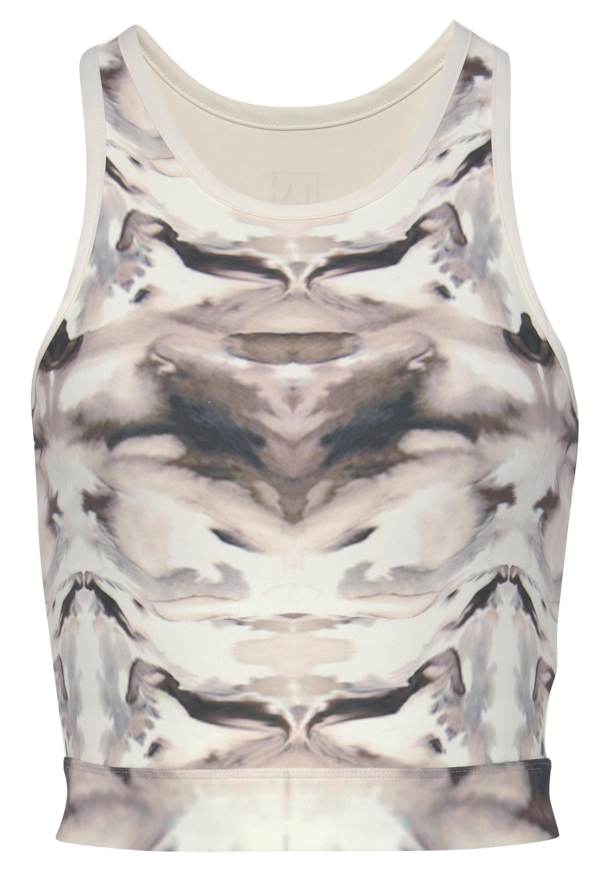 Atmungsaktives Athleisure-Crop-Top von Lascana Active mit abstraktem Druck vorn und am breiten Bündchen. Kontrastfarben eingefasste Träger und Armausschnitte. Ringerrücken mit Cut-out und kleinem Markenschriftzug. Super für schweißtreibende Work-outs und andere intensive Sportarten. Elastisches Funktionsmaterial.