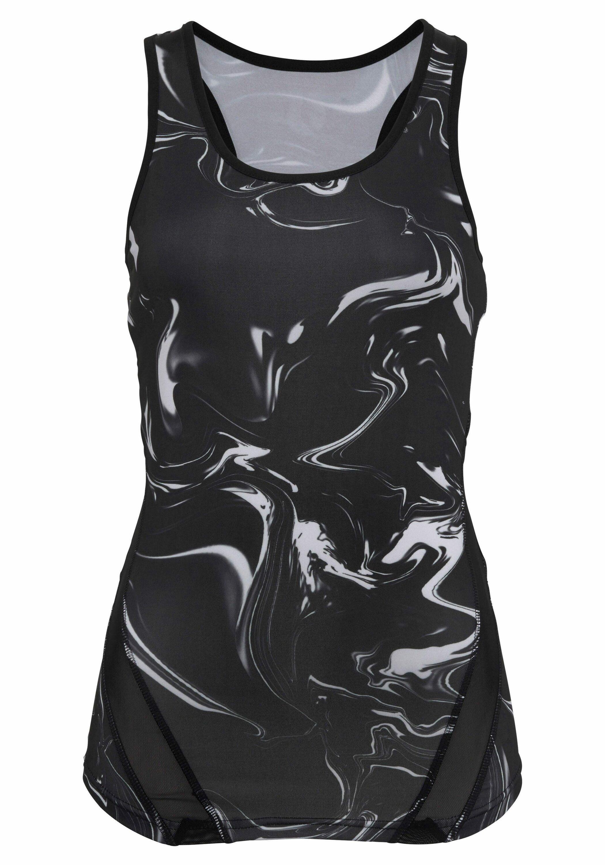 Mit Racerback. Mesh-Einsätze vorn und hinten. Der ideale Style für Fitness, Yoga und viele weitere Aktivitäten. Angenehm zu tragendes, elastisches Funktionsmaterial aus 85% Polyester, 15% Easthan. Mesh- Einsätze aus 90% Polyamid und 10% Elasthan.