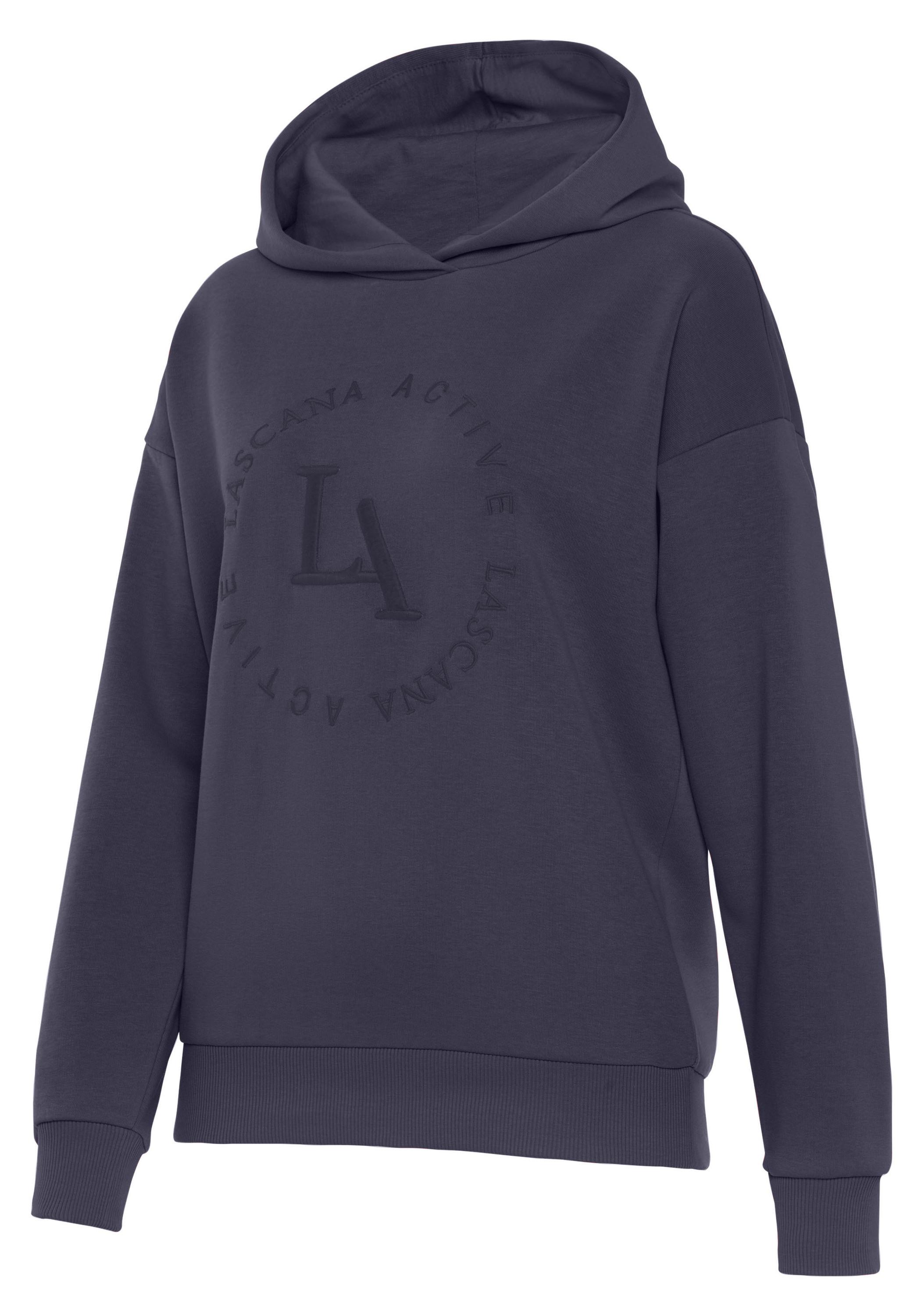 Lascana Active Hoodie mit großer Logo Stickerei auf der Vorderseite und leicht überschnittenen Schultern, sowie mit weichem Ripp-Bund an den Ärmeln und Saum. Aus 60% Baumwolle und 40% Polyester.