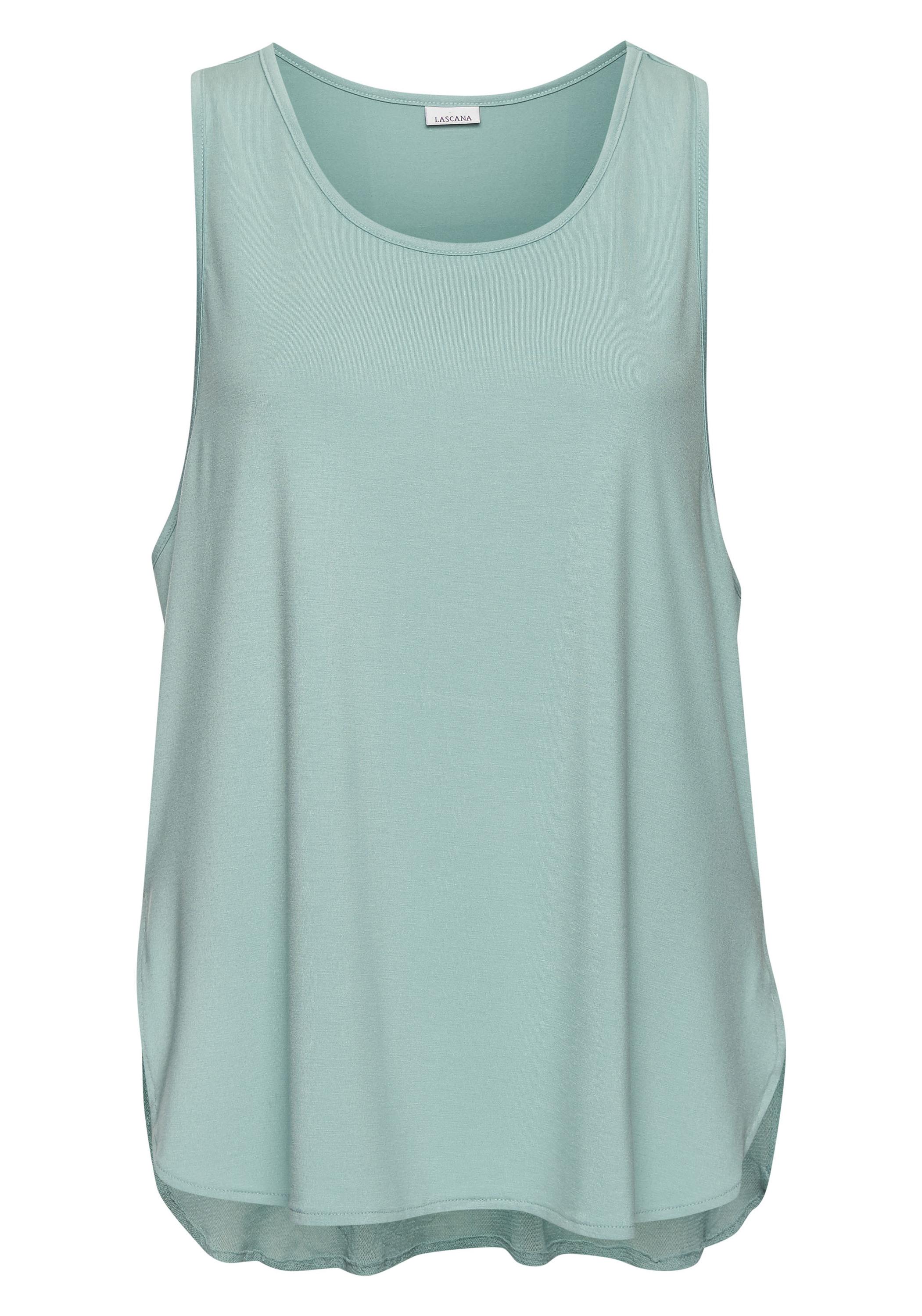 Locker geschnittenes Tanktop von Lascana Active mit Mesh-Einsatz auf der Rückseite. Rundhalsausschnitt und weit ausgeschnittene Armlöcher. Abgerundeter Bund mit seitlichen Schlitzen. Kleiner Logodruck auf der Rückseite. Weich fließende Qualität.