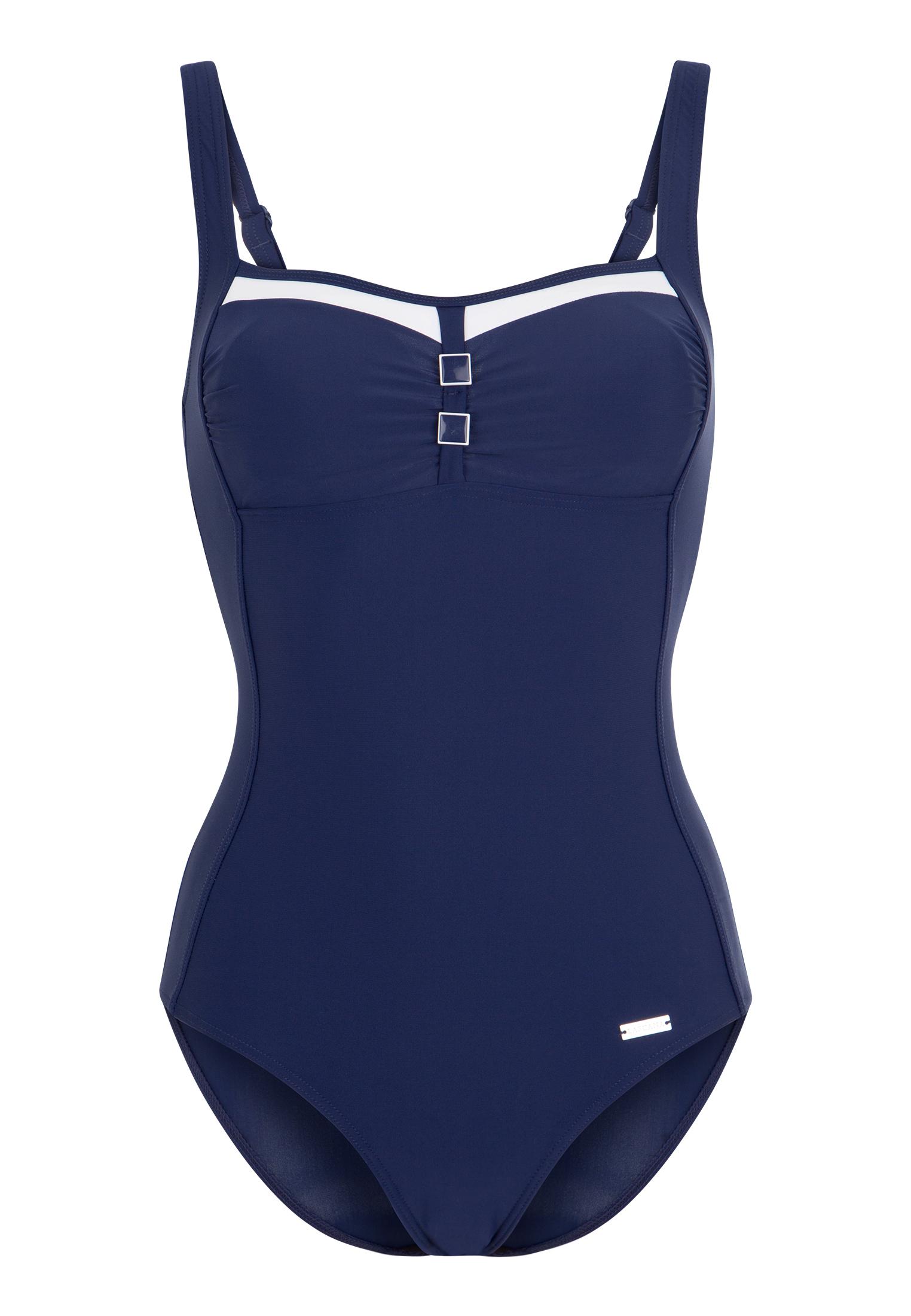 Stilvoller Badeanzug von Lascana im Marine-Design. Raffiniert: Vordermieder schmälert optisch. Integrierte Softcups. Träger verstellbar. Verzierungen im Brustbereich. Angenehmes Material.