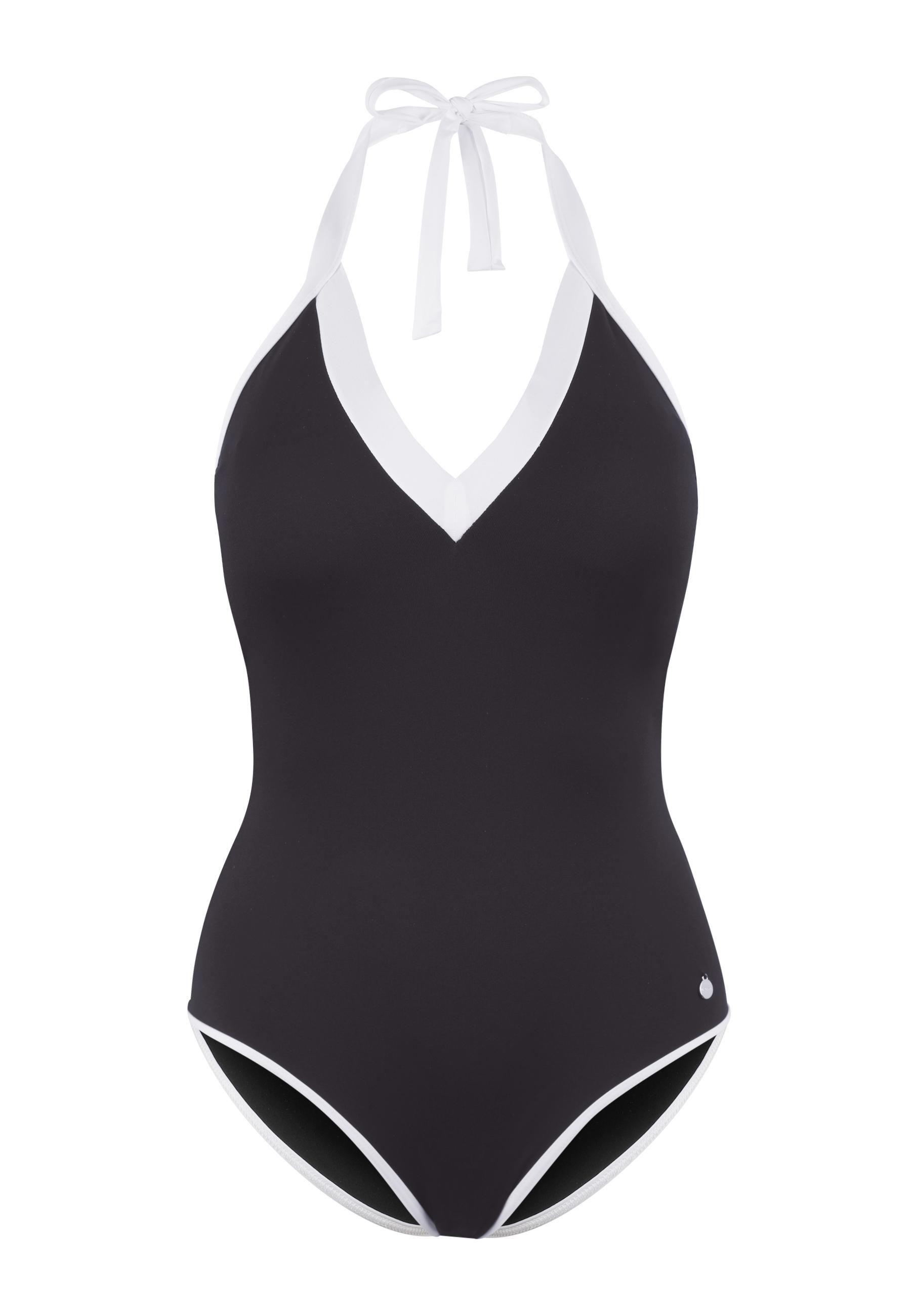 Badeanzug von Lascana in schwarz-weiß, mit herausnehmbaren Cups tiefer Rückenausschnitt und im Nacken zu binden. Obermaterial: 80% Polyamid, 20% Elasthan. Futter: 100% Polyamid