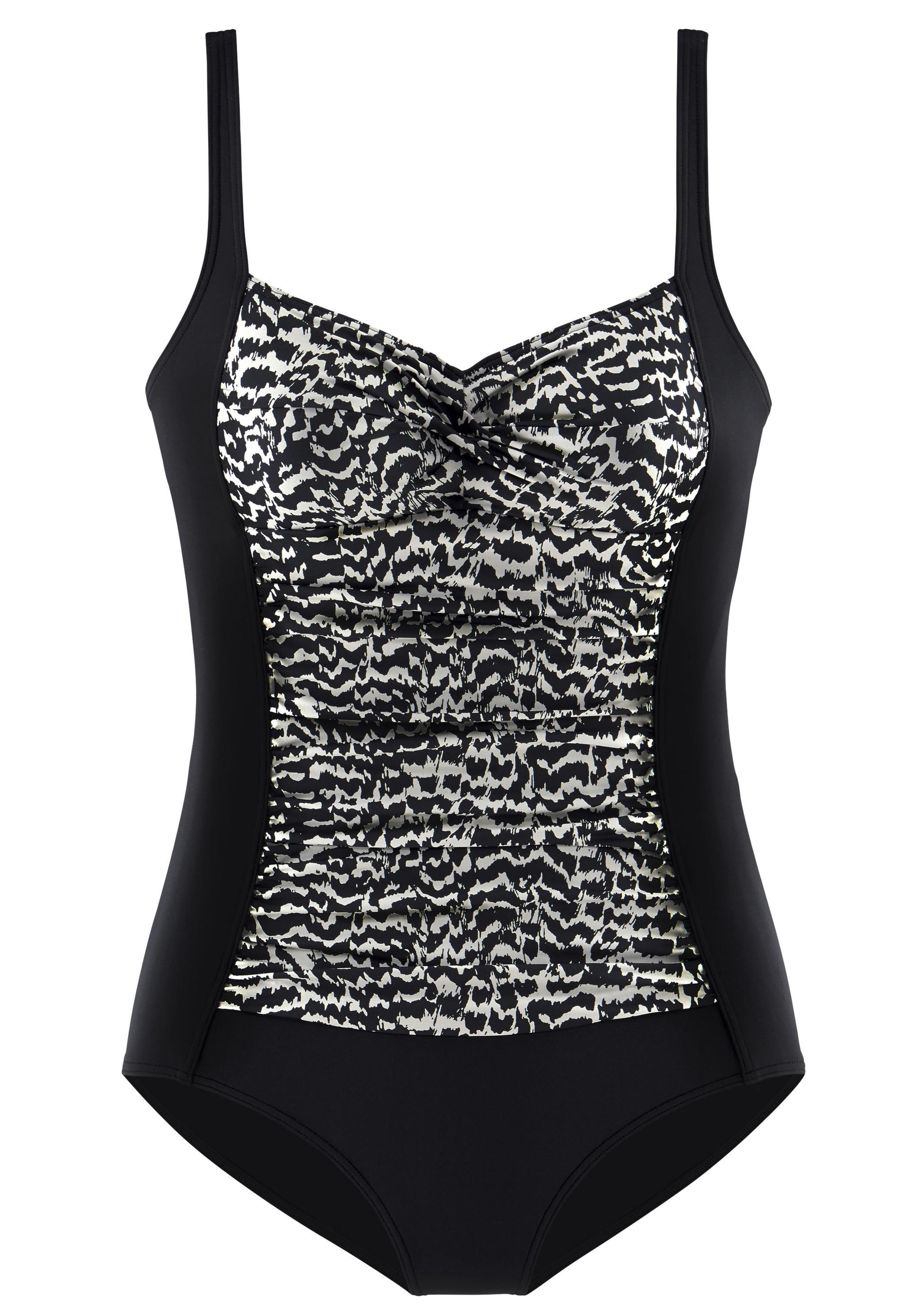 Raffinierter Look: Badeanzug von Lascana mit eckigem Ausschnitt. Trendig gemusterter Miedereinsatz mit Shaping-Effekt. Komfortable Passform mit eingearbeiteten Softcups und Unterbrustgummi. Verstellbare Träger. Flacher Beinausschnitt. Angenehme Qualität.