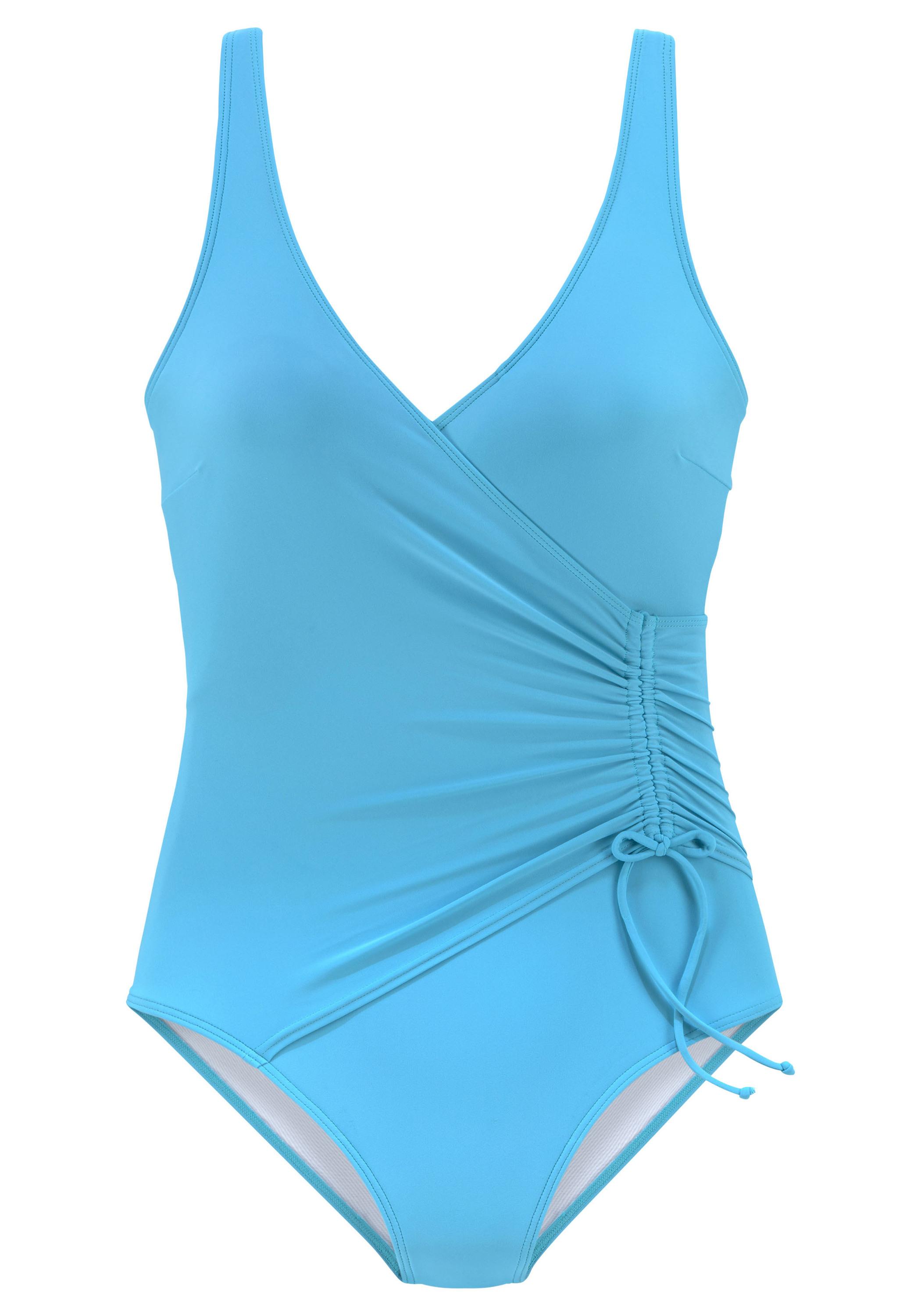 Badeanzug von Lascana in modischer Wickeloptik. Seitliche Tunnelzugraffung. Unterbrustgummi vorn. Breite Träger zum Verstellen. Elastisches Material mit recyceltem Polyamid.