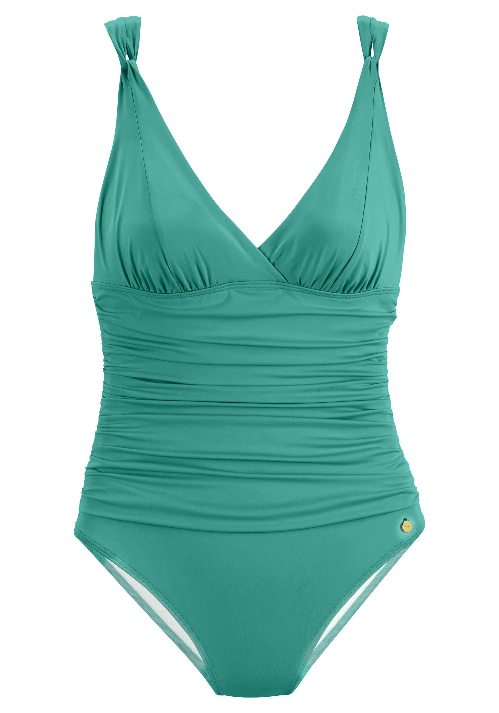 Badeanzug von Lascana mit schmeichelnden Raffungen. Integrierte Softcups. Tiefer V-Ausschnitt vorn. Hoher und gerader Ausschnitt hinten. Bequeme Passform. Mit recycelten Fasern.