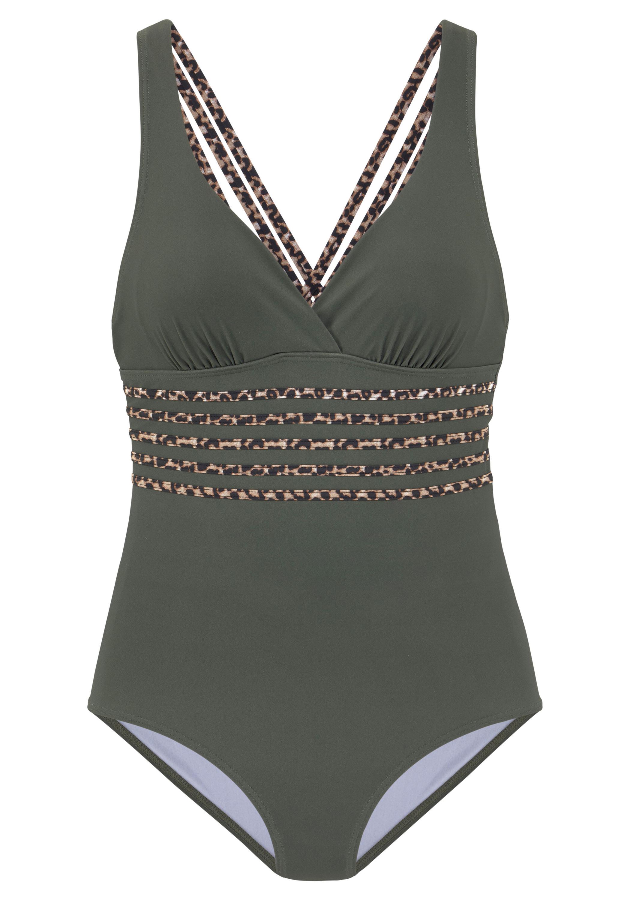 Badeanzug von Lascana mit angesagten Leoprint-Details in der Taille und an den überkreuzten Rückenträgern. Shaping-Einsatz vorn. Integrierte Softcups. Trageangenehme Qualität.