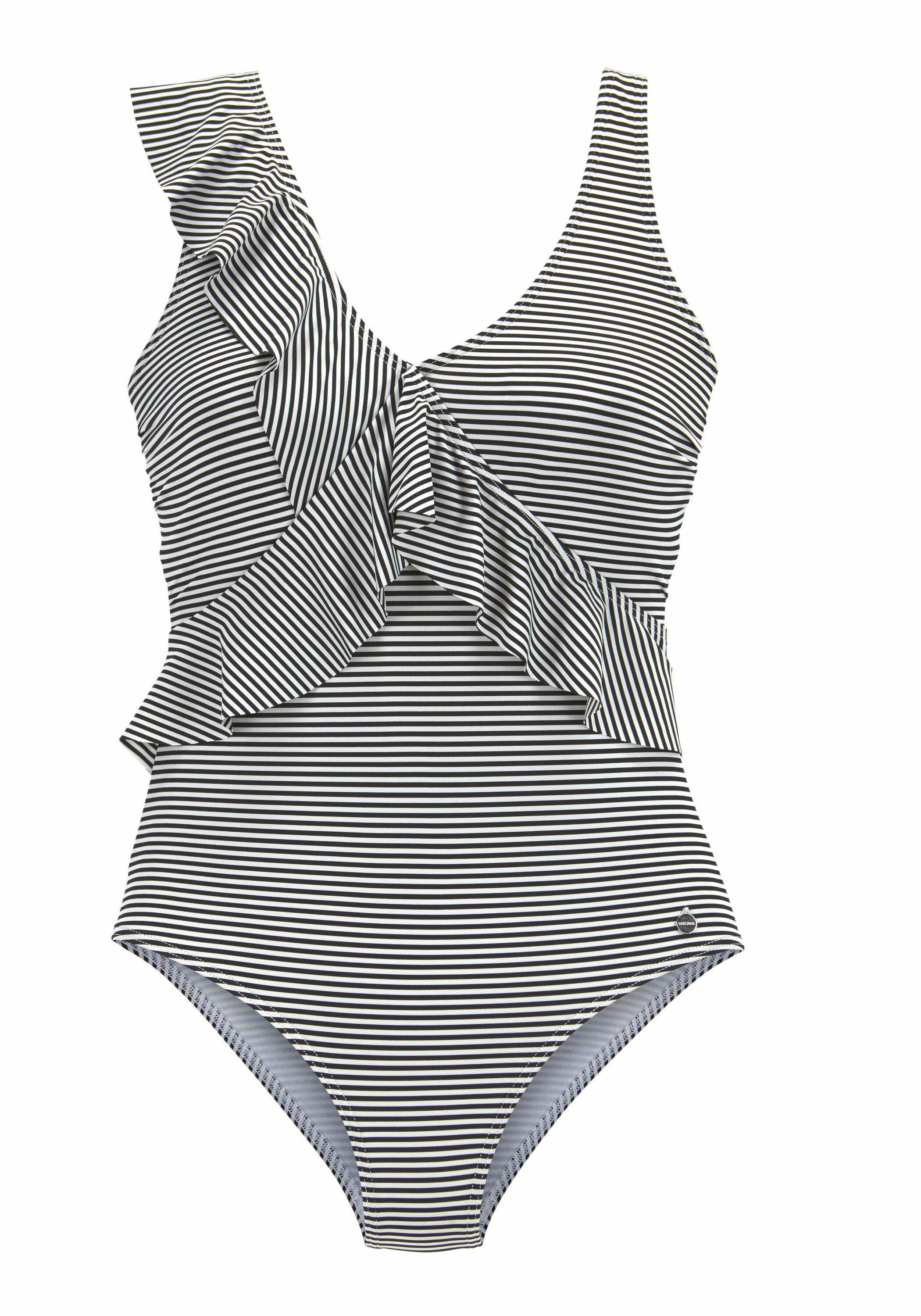 Badeanzug mit breiten Volants für 5 verschiedene Tragevarianten. Herausnehmbare Cups. Unterbrustgummi vorn. Softe Microfaser-Qualität.