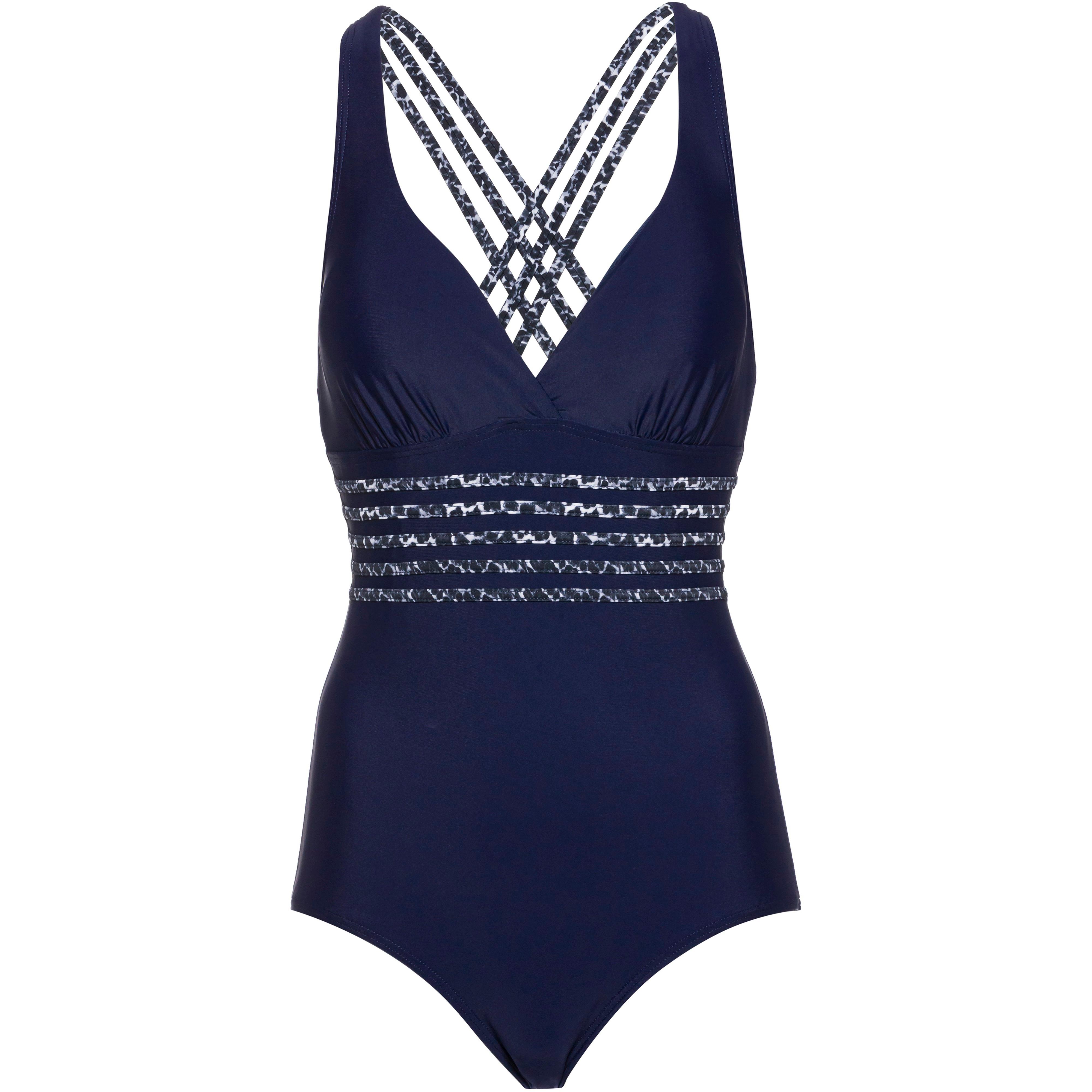 Badeanzug mit Streifen in Leo-Optik; tiefer V-Ausschnitt; herausnehmbare Softcups und das Vordermieder sorgen für guten Halt; raffinierte Rückenlösung mit 3 überkreuzten Bändern; normaler Beinausschnitt; mit recycelten Materialien hergestellt; Material 82% Polyamid, 18% Elastan.