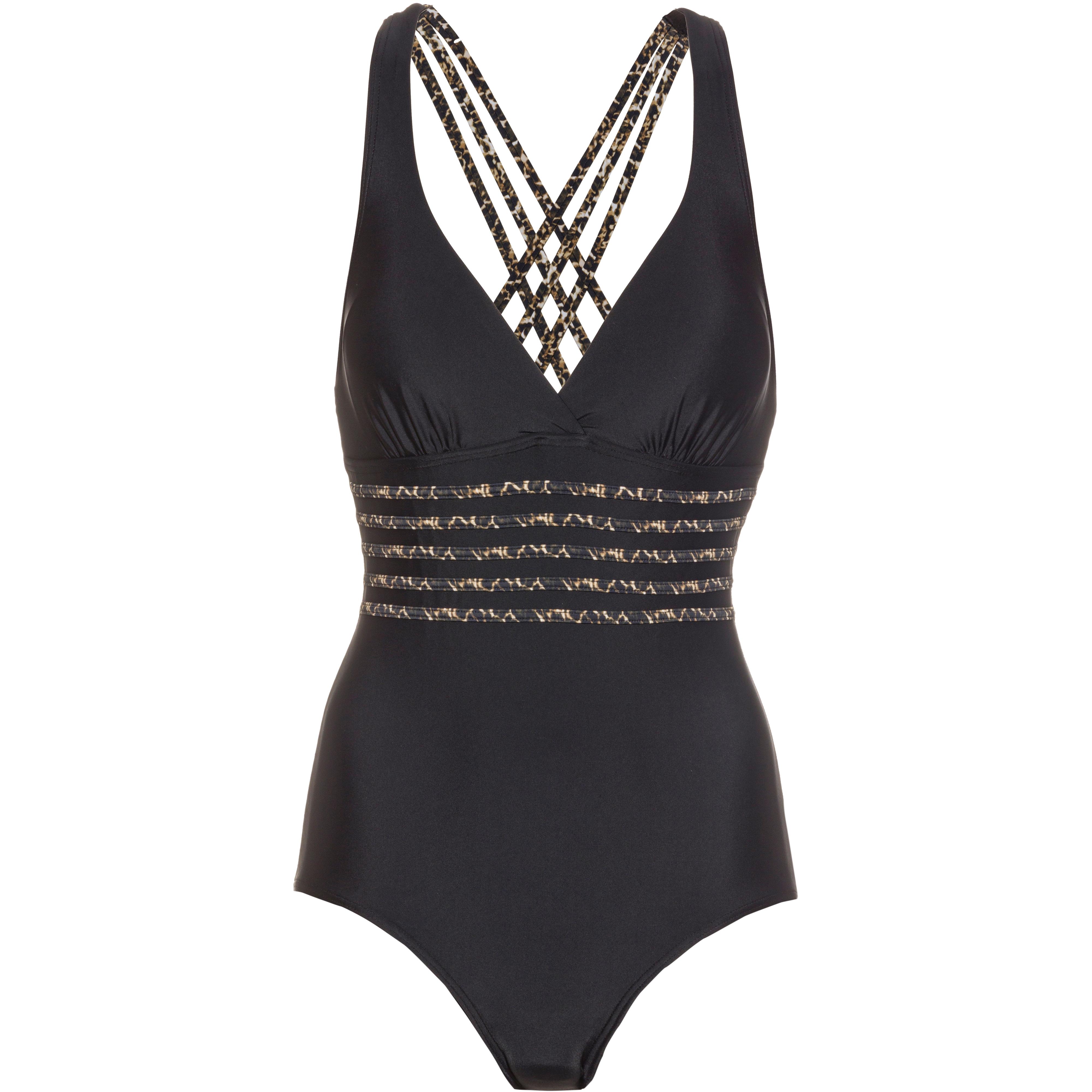 Badeanzug mit Streifen in Leo-Optik; tiefer V-Ausschnitt; herausnehmbare Softcups und das Vordermieder sorgen für guten Halt; raffinierte Rückenlösung mit 3 überkreuzten Bändern; normaler Beinausschnitt; mit recycelten Materialien hergestellt; Material 82% Polyamid, 18% Elastan.