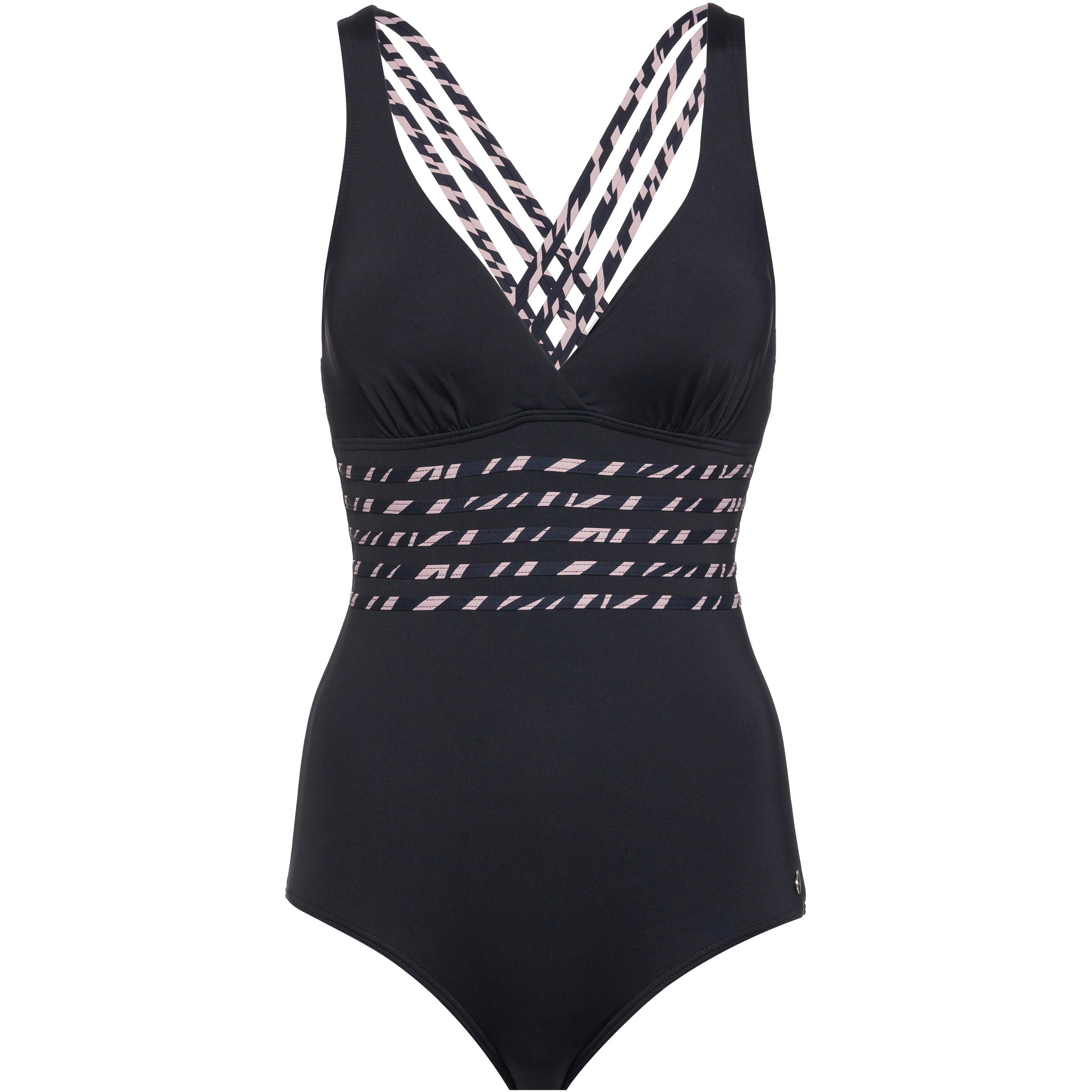 Feminin geschnittener Badeanzug mit leichter Shaping Funktion, aus schnelltrocknendem Stretchgewebe; tiefer V-Ausschnitt; stylisher Unterbrustbereich; mehrfach gekreuztes Trägersystem im Rückenbereich; mittlerer Beinausschnitt; wattierte Cups für optimalen Halt; Material I 83% Polyamid, 17% Elastan, Material II 100% Polyester, Material III 82% Polyamid, 18% Elastan.