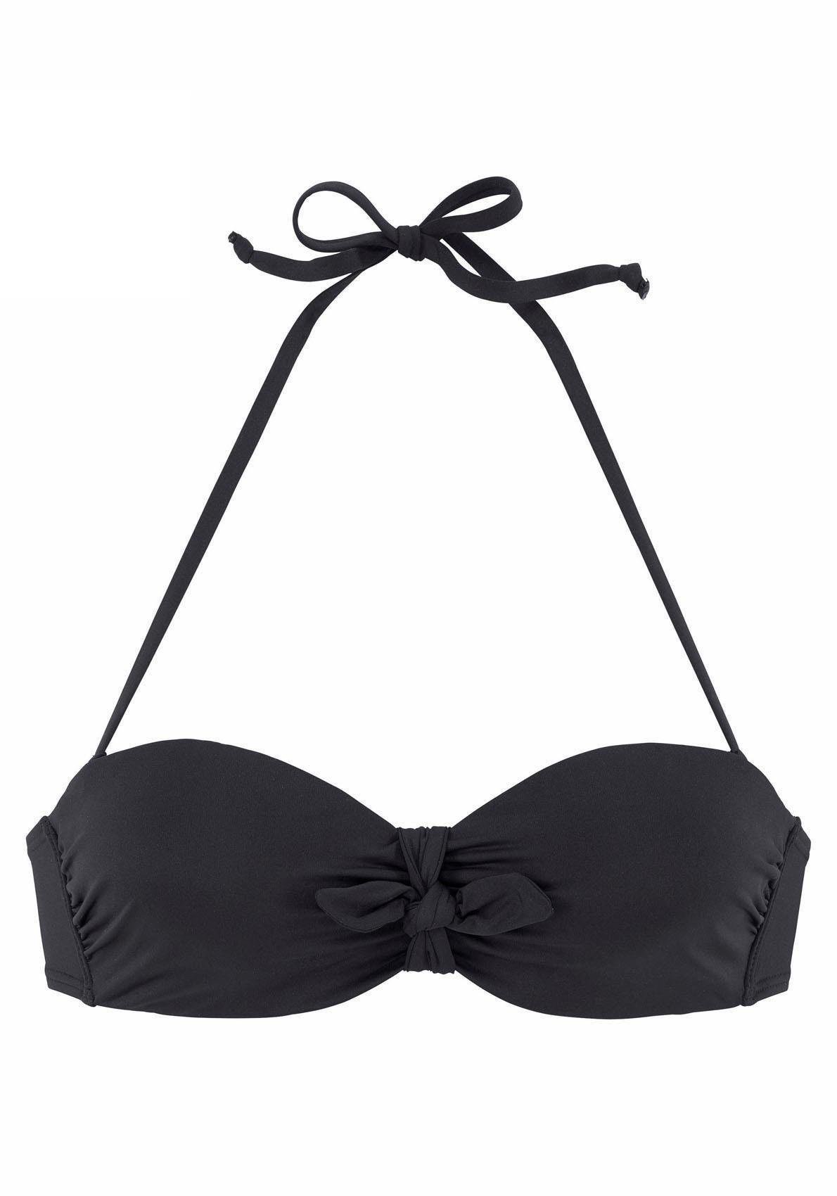 In Schwarz. Wattierte Cups, in Cup A und B zusätzlich mit herausnehmbaren Kissen. Zierschleife vorn. Seitliche Stäbchen für einen guten Halt. Abnehmbare Träger, im Nacken zu binden. Top im Rücken zu schließen. Softe Microfaser.