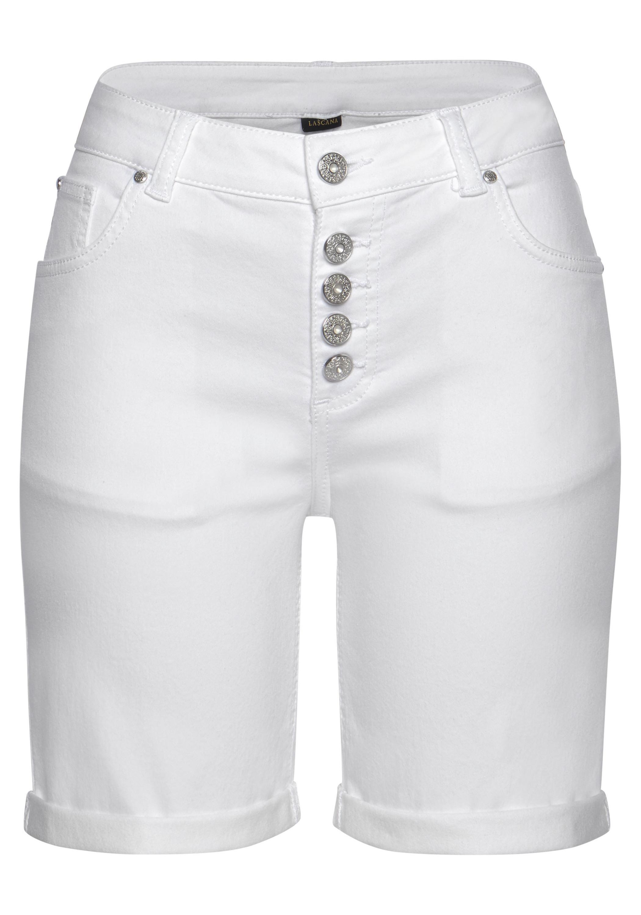 Mit Krempelbund und 5 Knöpfen vorn. Je 2 Taschen seitlich und hinten. Innenbeinlänge ca. 18 cm. Aus 66% Baumwolle (unterstützt Cotton made in Africa), 31% Polyester, 3% Elasthan.