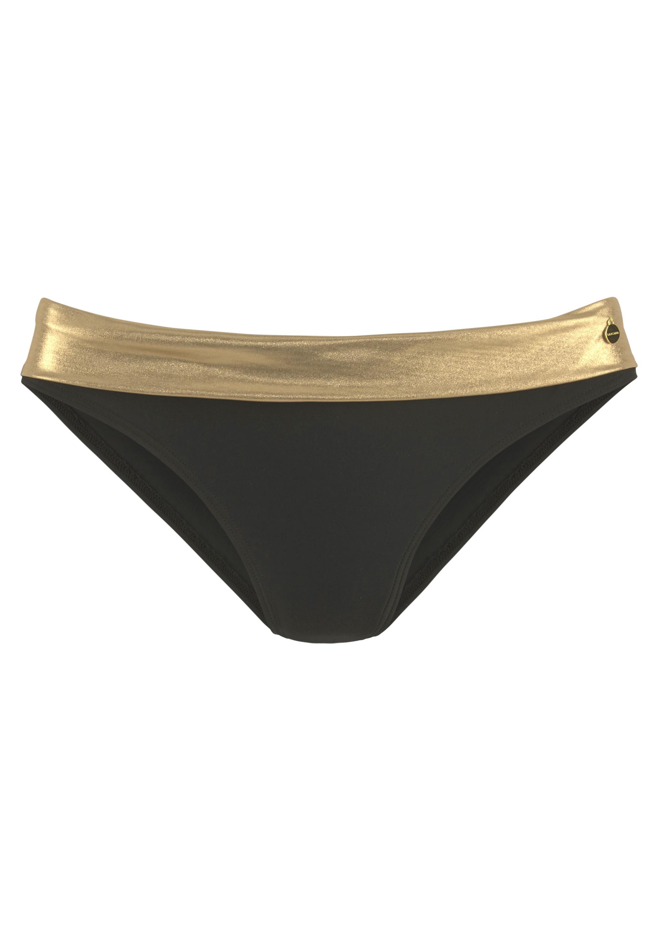 Bikinihose von Lascana. Goldfarben glänzender Umschlagbund mit kleinem Metallemblem. Einfach mit einem passenden Bikinitop kombinieren. Trageangenehm dank weicher, gefütterter Qualität.