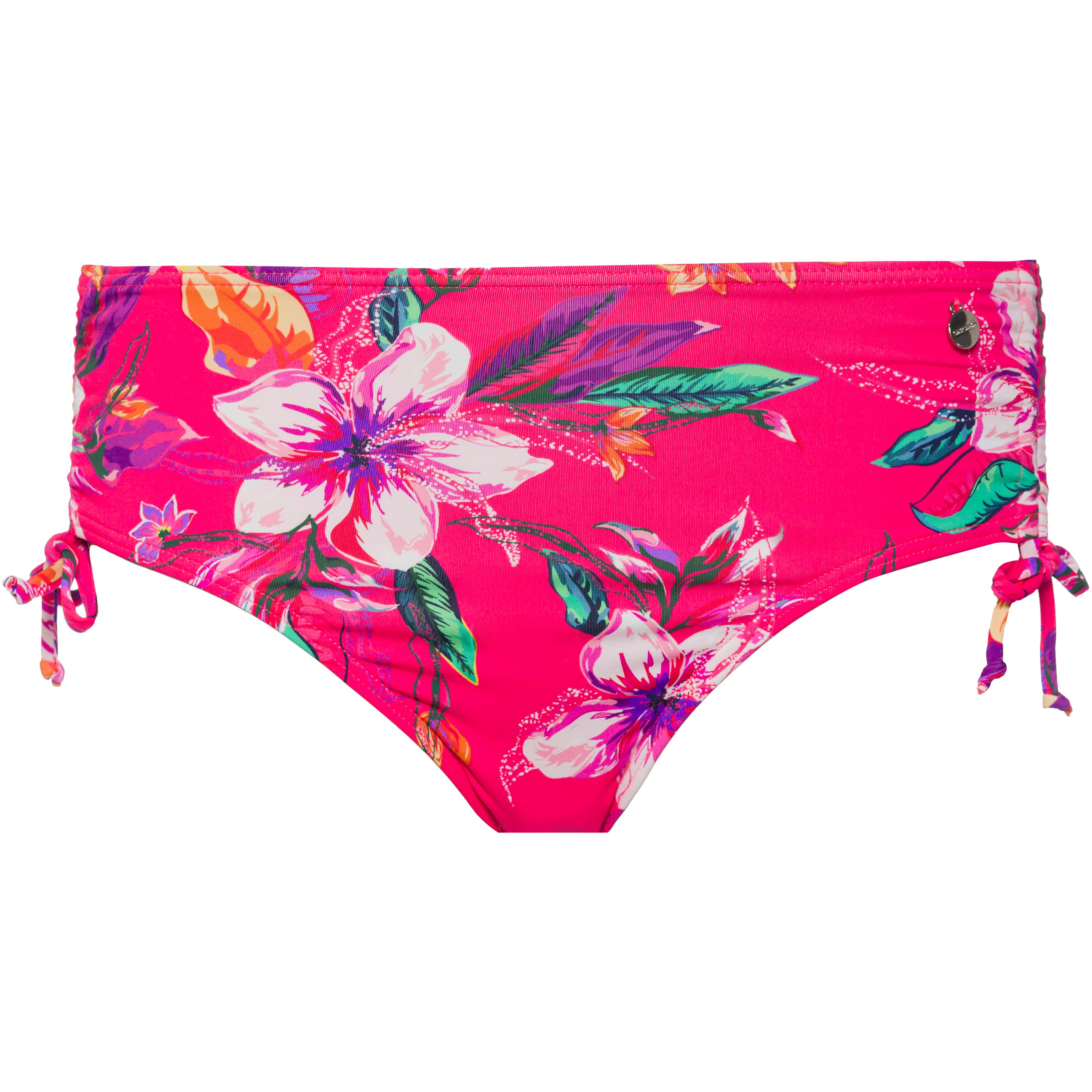 Bikini-Hose mit floralen Prints; höher geschnittener Bund, der bei Bedarf umgeschlagen werden kann; seitliche, durch Schnürung verstellbare Raffung; softe Microfaser-Qualität; elastisch; Material 84% Polyamid, 16% Elastan, Material II 100% Polyester.