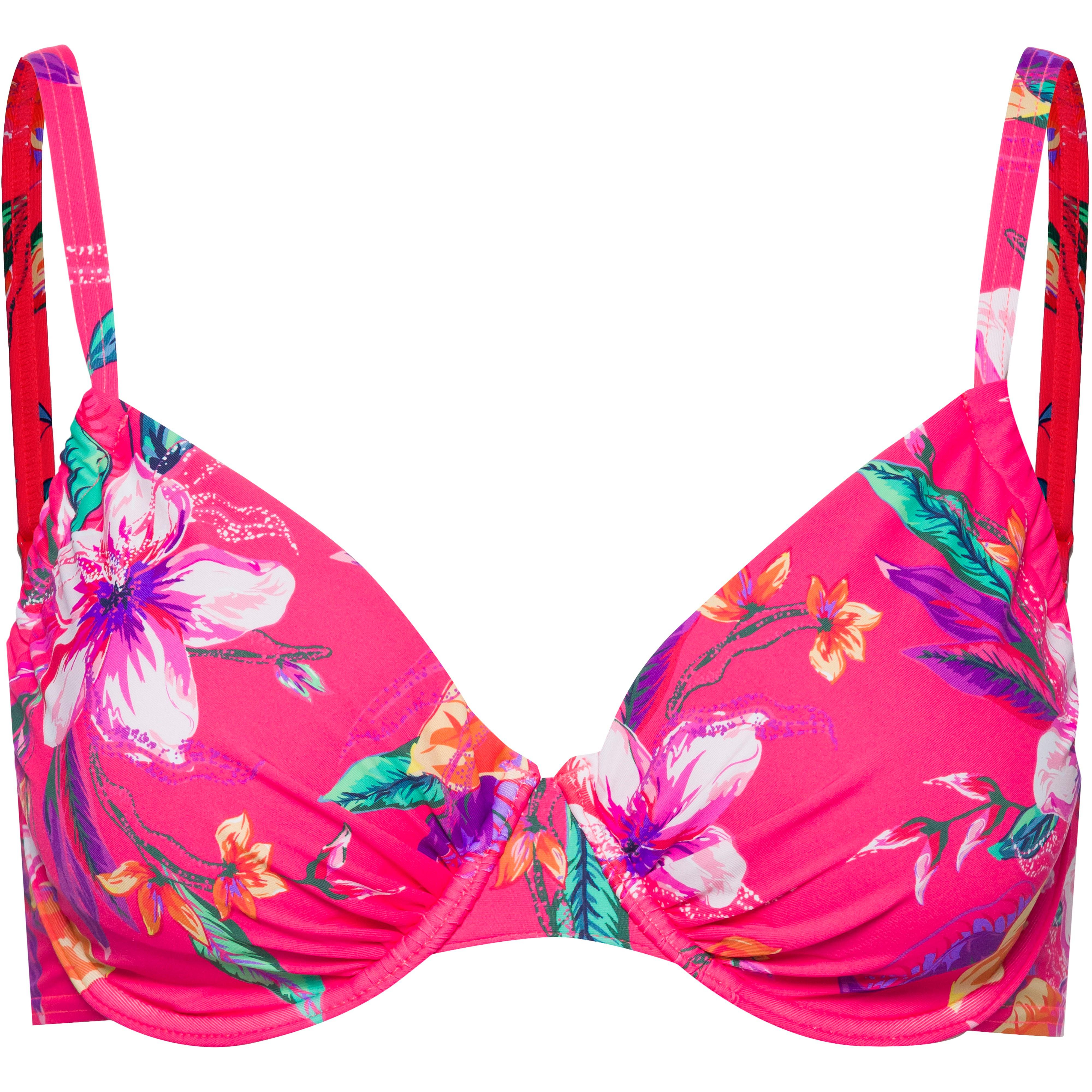 Bügel-Bikini-Oberteil mit floralen Prints; stabile Bügel sorgen für Halt; verstellbare Träger; herausnehmbare Pads; Rückenverschluss aus Kunststoff; Mix-Kini kompatibel; softe Microfaser-Qualität; Material 84% Polyamid, 16% Elastan.