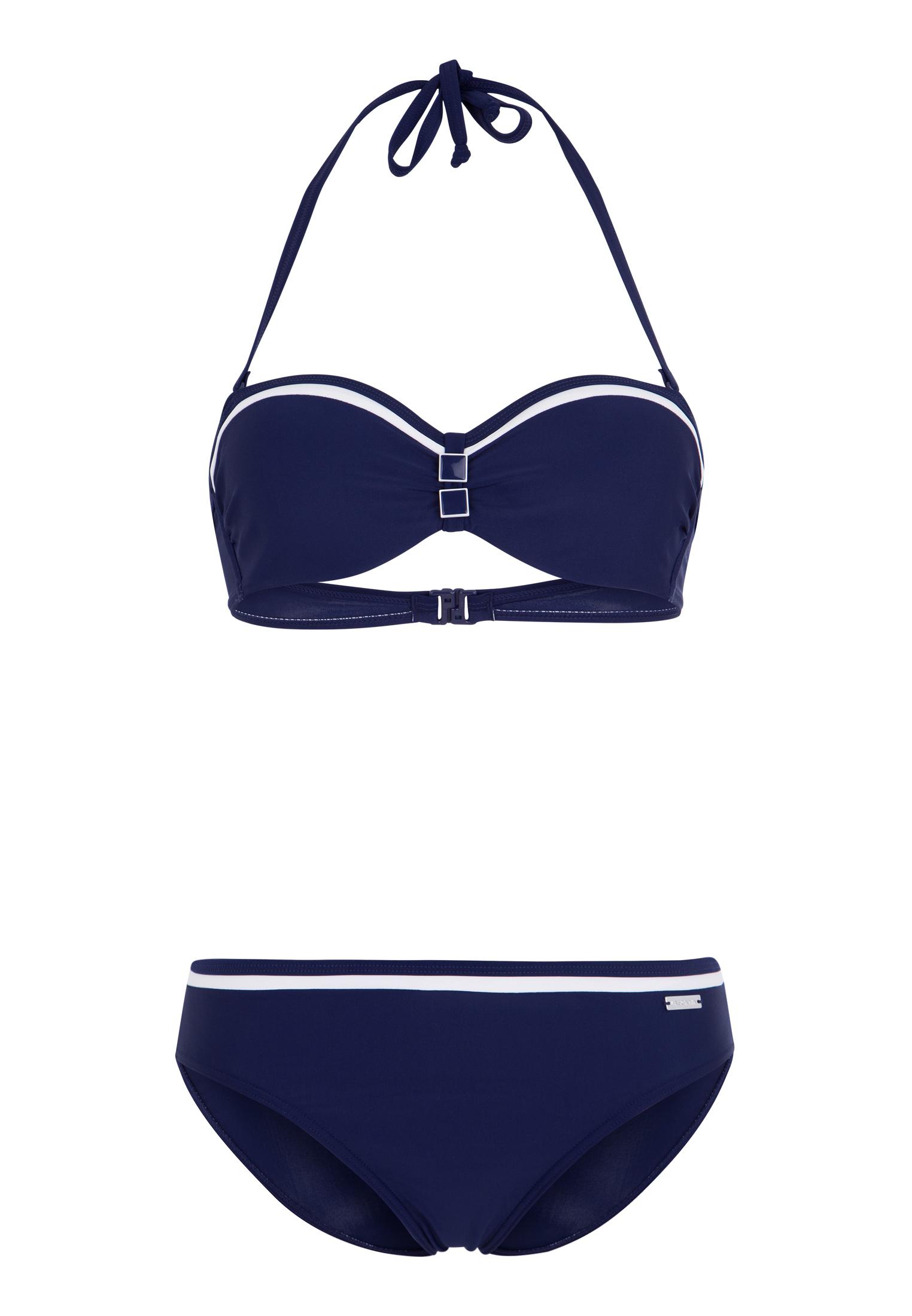Eleganter Bandeau-Bikini von Lascana. Moderner Marine-Stil mit Zier-Accessoires zwischen den Cups. Bügel und seitliche Stäbchen für einen perfekten Halt. Abnehmbare Nackenträger. Seitlich extrabreit geschnittene Hose. In weicher Qualität.