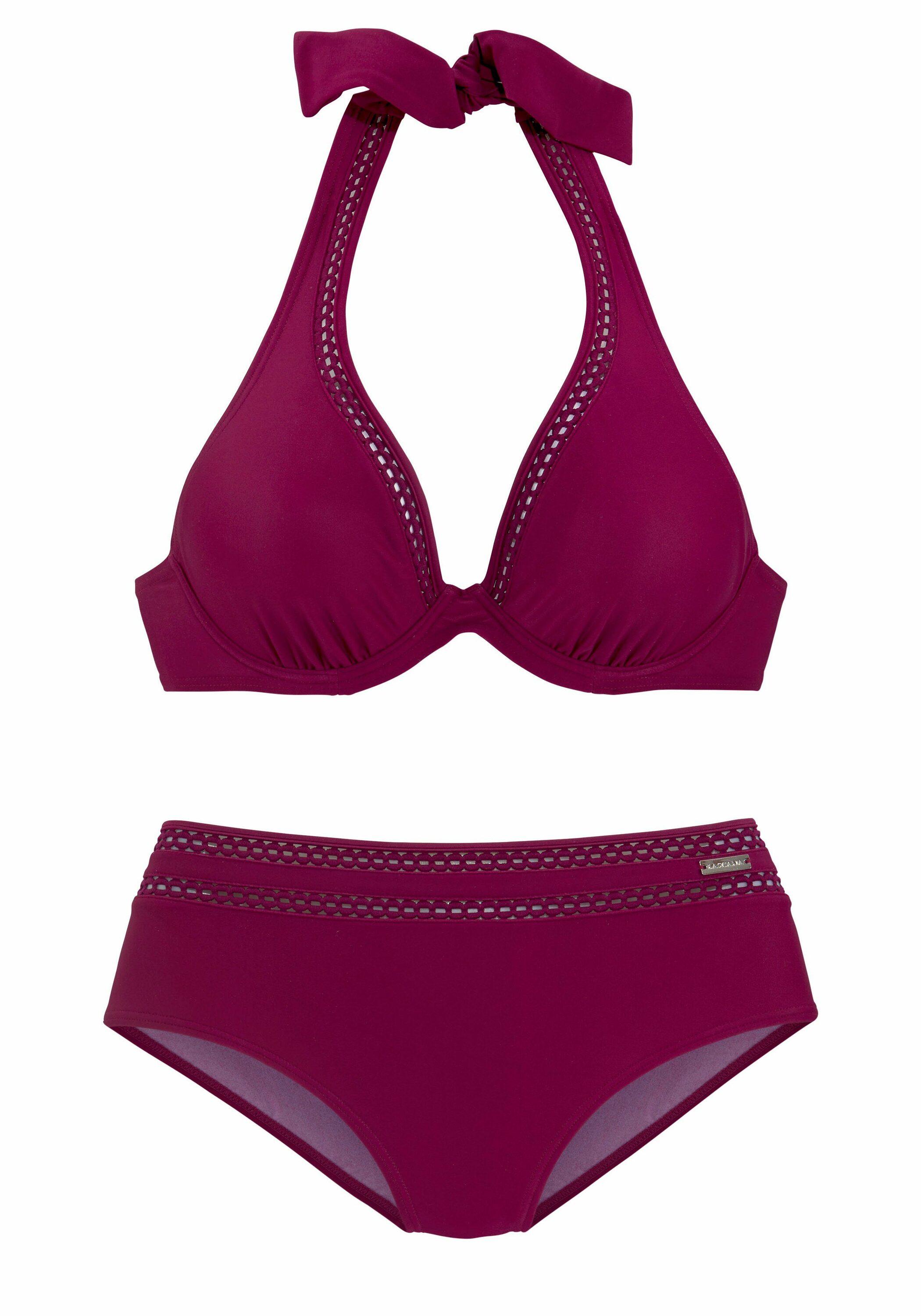 Bügel-Bikini von Lascana mit süßen Lochbodüren. Neckholder zum Binden. Cups mit herausnehmbaren Kissen. Verschluss im Rücken. Etwas höher geschnittene Bikinihose. Angenehme Qualität.