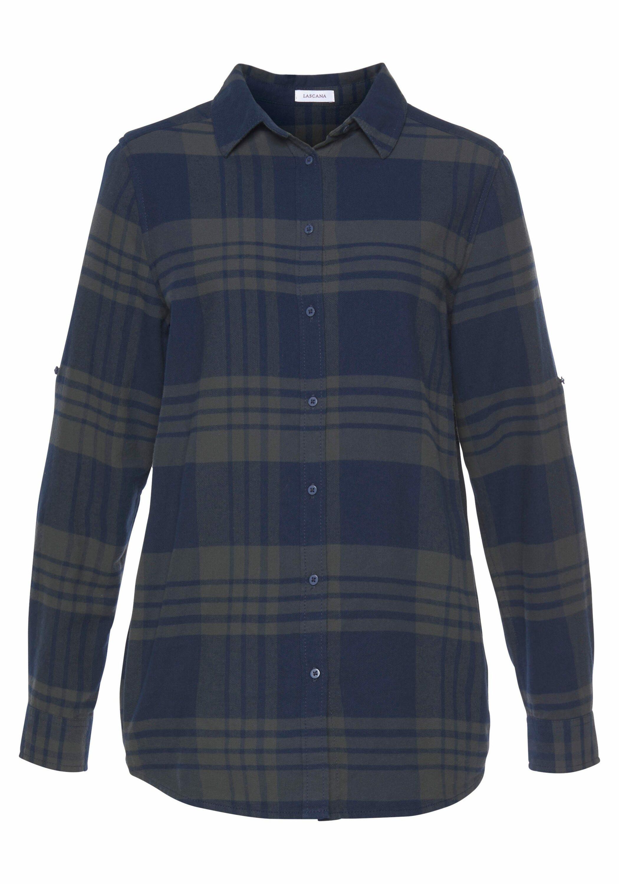 Karobluse von Lascana aus weichem Flanell. Knopfleiste und lange Ärmel. Mit Riegel am Ärmel zum Krempeln. Länge ca. 75 cm. Aus 100% Baumwolle (unterstützt Cotton made in Africa).