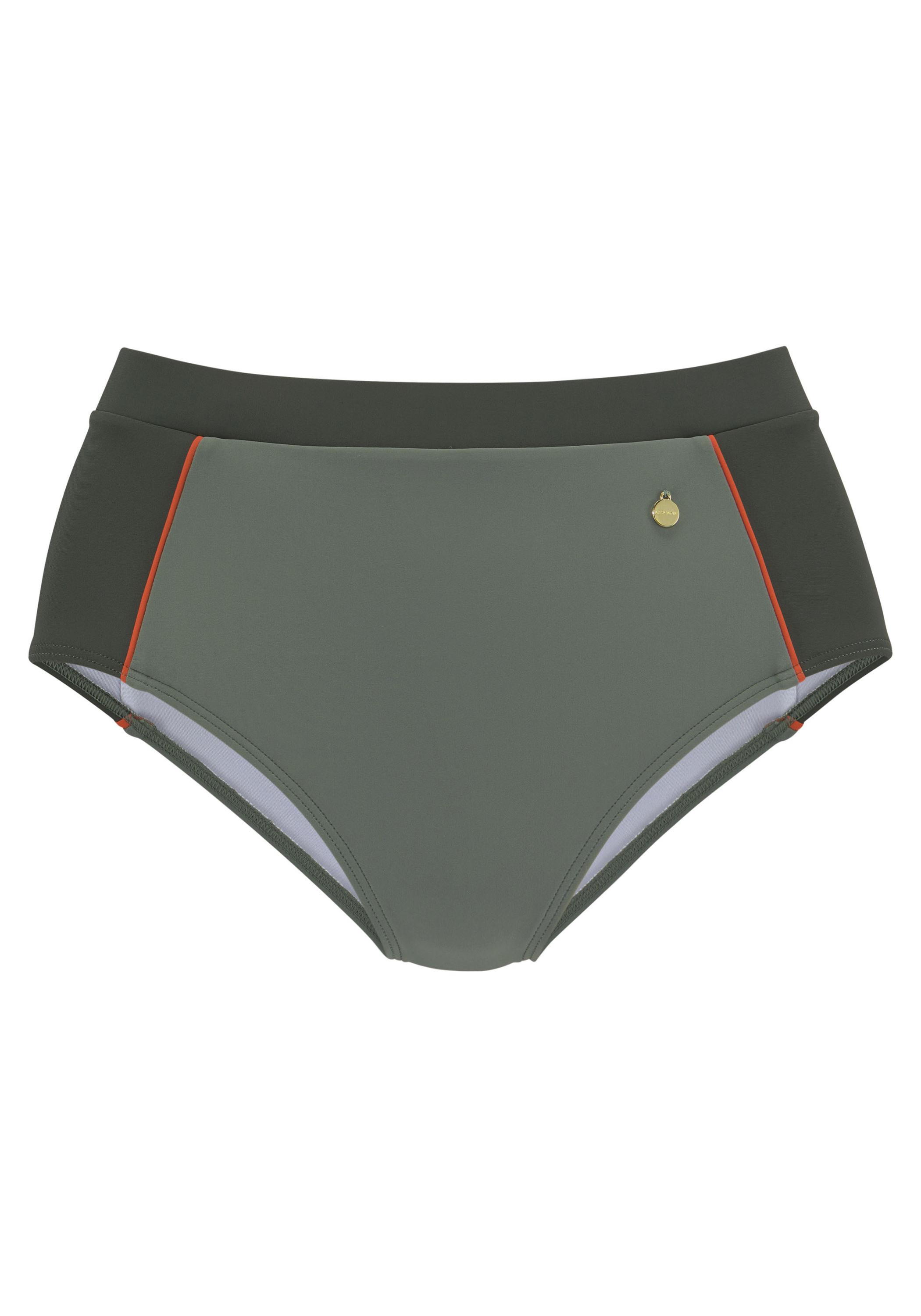 Bikinihose von Lascana. Abgesetzte Vorderseite mit kontrastierender Paspel und Logo-Plakette. Breiter Steg, flacher Beinausschnitt, High-waist-Bund. Zum Mixen mit diversen Oberteilen. Aus elastischem Material mit recyceltem Polyamid.