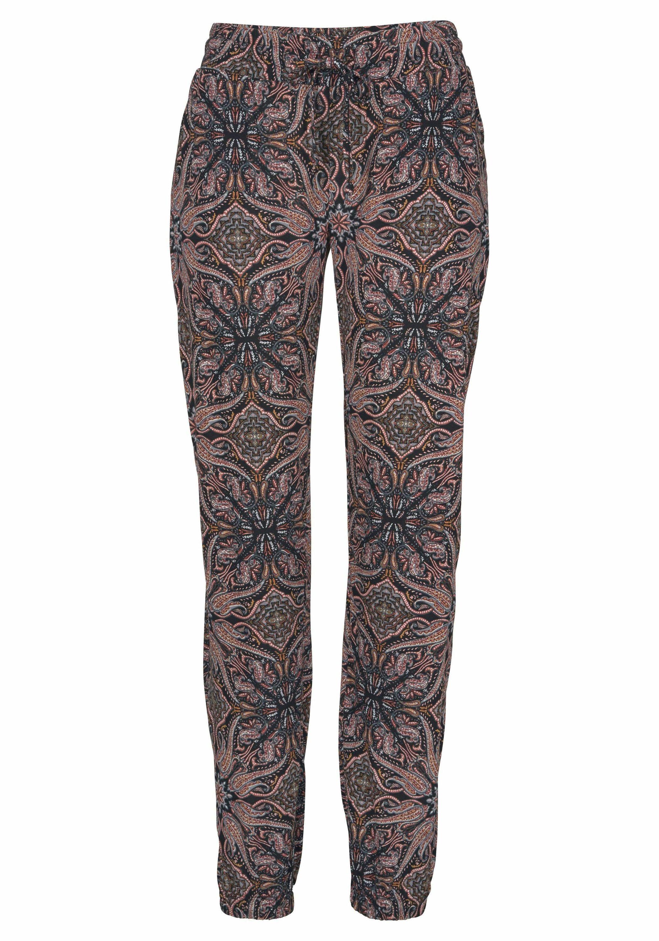 Jerseyhose mit Alloverdruck. Bequemer Smokbund. Kordelzug am Bündchen. Gerade Beinform mit Gummizug an den Beinabschlüssen. Innenbeinlänge ca. 76 cm. Aus 100% Viskose.