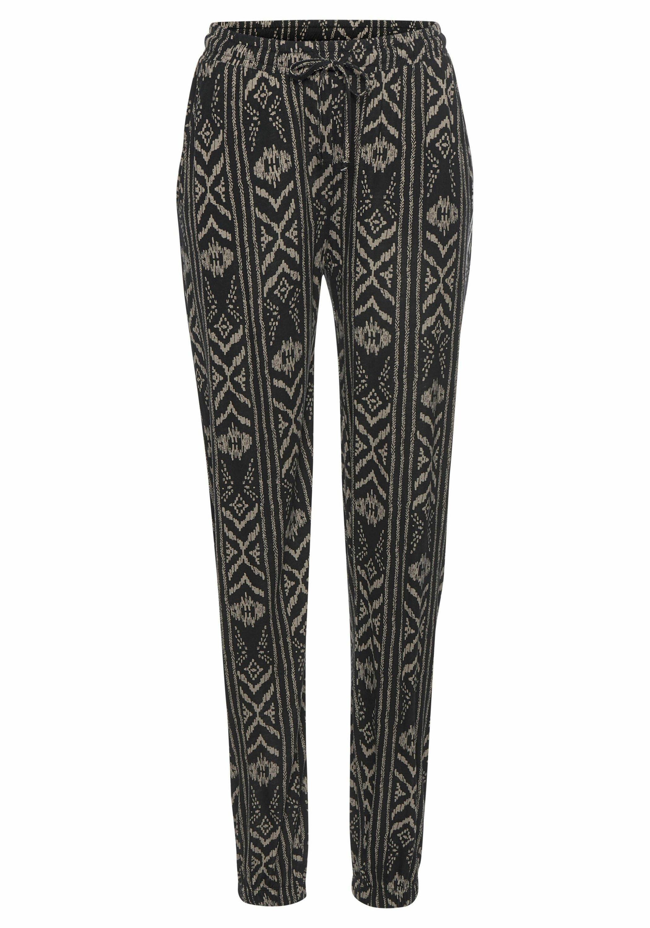 Jerseyhose von LASCANA mit Alloverdruck, jedes Teil ein Unikat. Mit Gummizügen am Bund und Saum. Zierkordel am Bündchen. Innenbeinlänge ca. 76 cm. Aus 100% Viskose.
