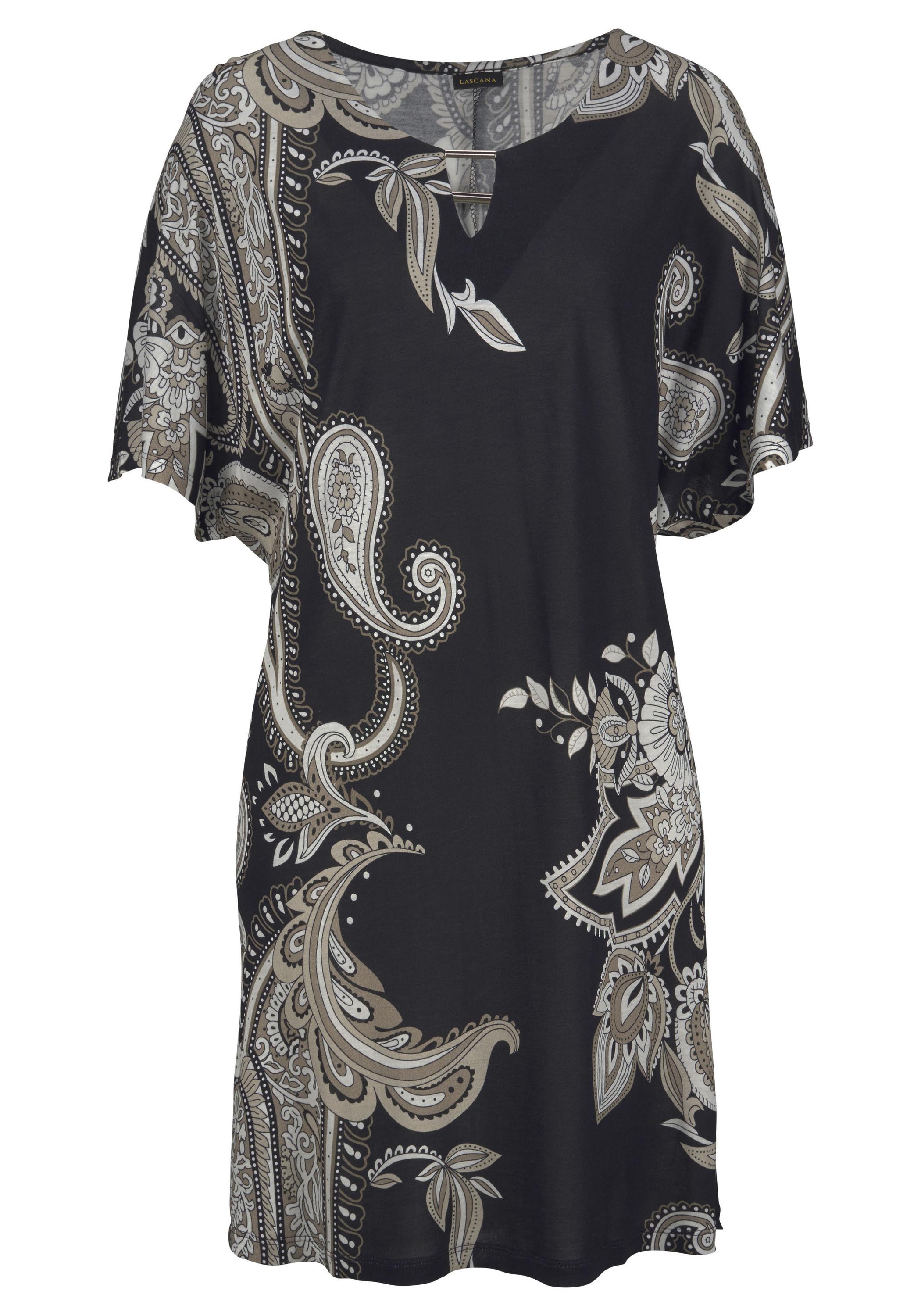 Longshirt von LASCANA. Kann als Minikleid oder über einer Leggings getragen werden. Vorn am Ausschnitt mit goldenfarbenem Accessoire. Weite, kurze Ärmel. Länge ca. 86 cm. Aus 100% Viskose.