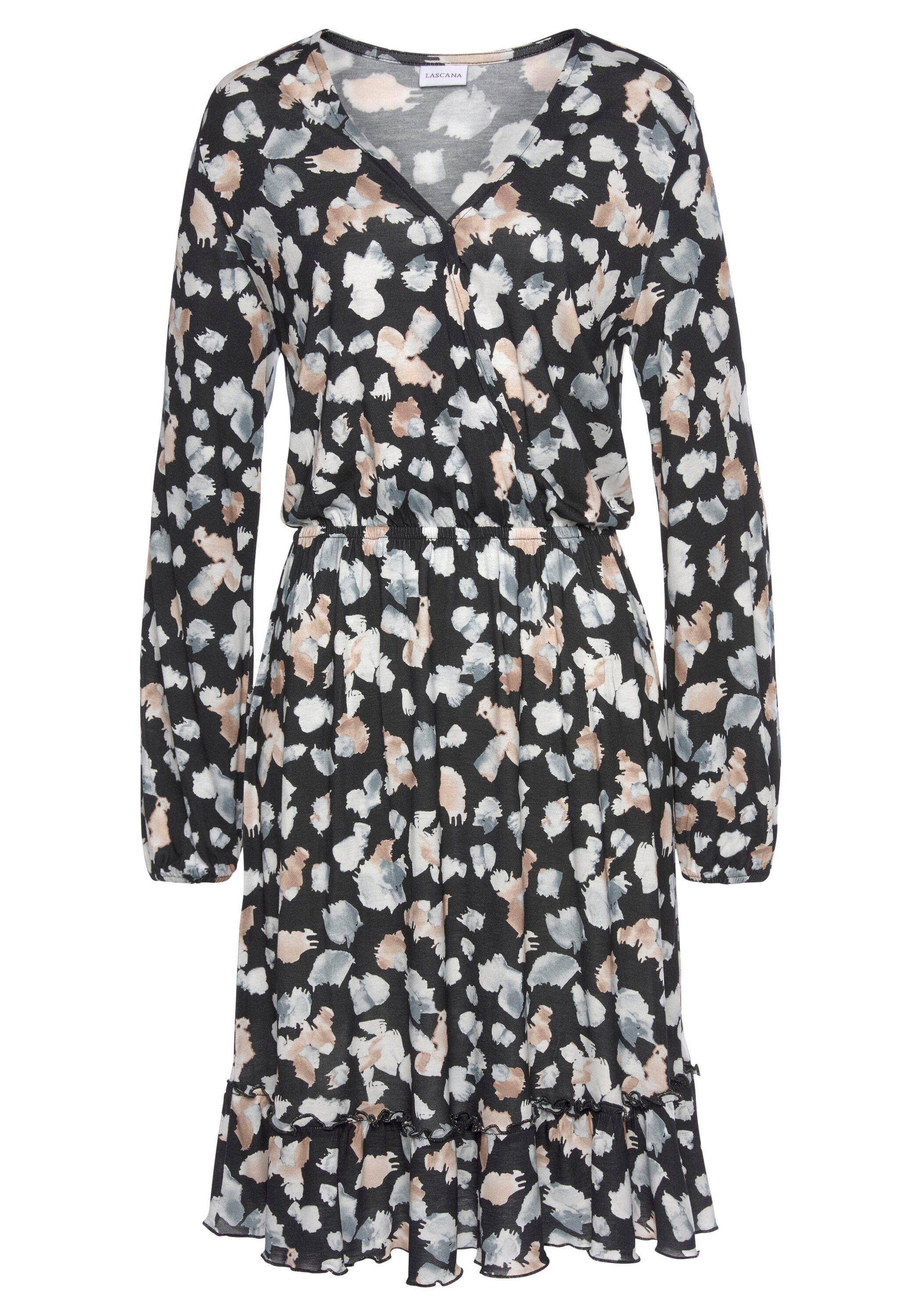 Bedrucktes Kleid von Lascana. Überlappender V-Ausschnitt mit Druckknopf. Lange Ärmel mit elastischem Bund. Gummibund in der Taille. Rockteil mit verspieltem Volant. Für viele Gelegenheiten. Weich fließende Viskosequalität.