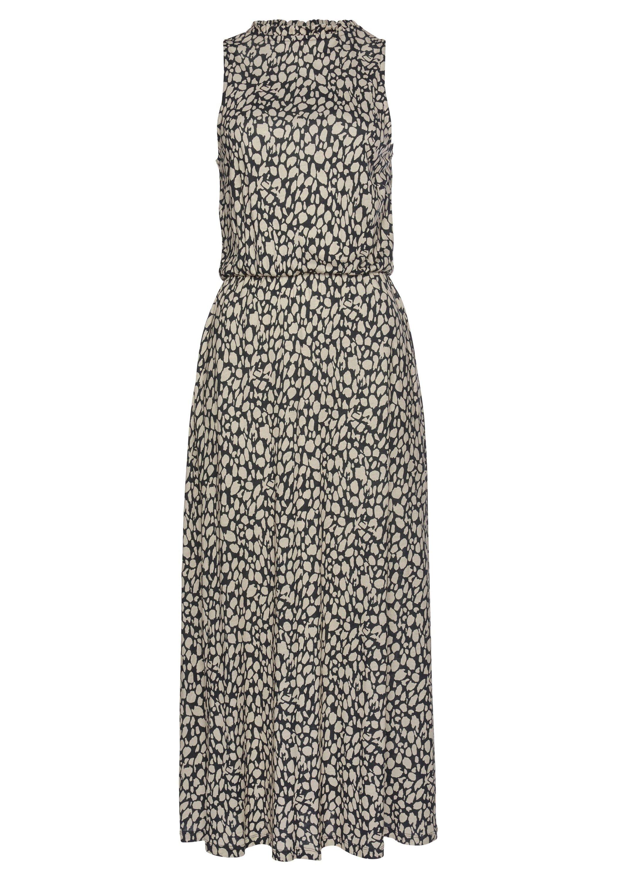Maxikleid von Lascana in modischer Länge. Hoher Halsausschnitt mit femininer Rüschenkante. Schlitz mit Knopfverschluss hinten. Mit Gummizug zur Betonung der Taille. In weicher Viskose-Qualität.