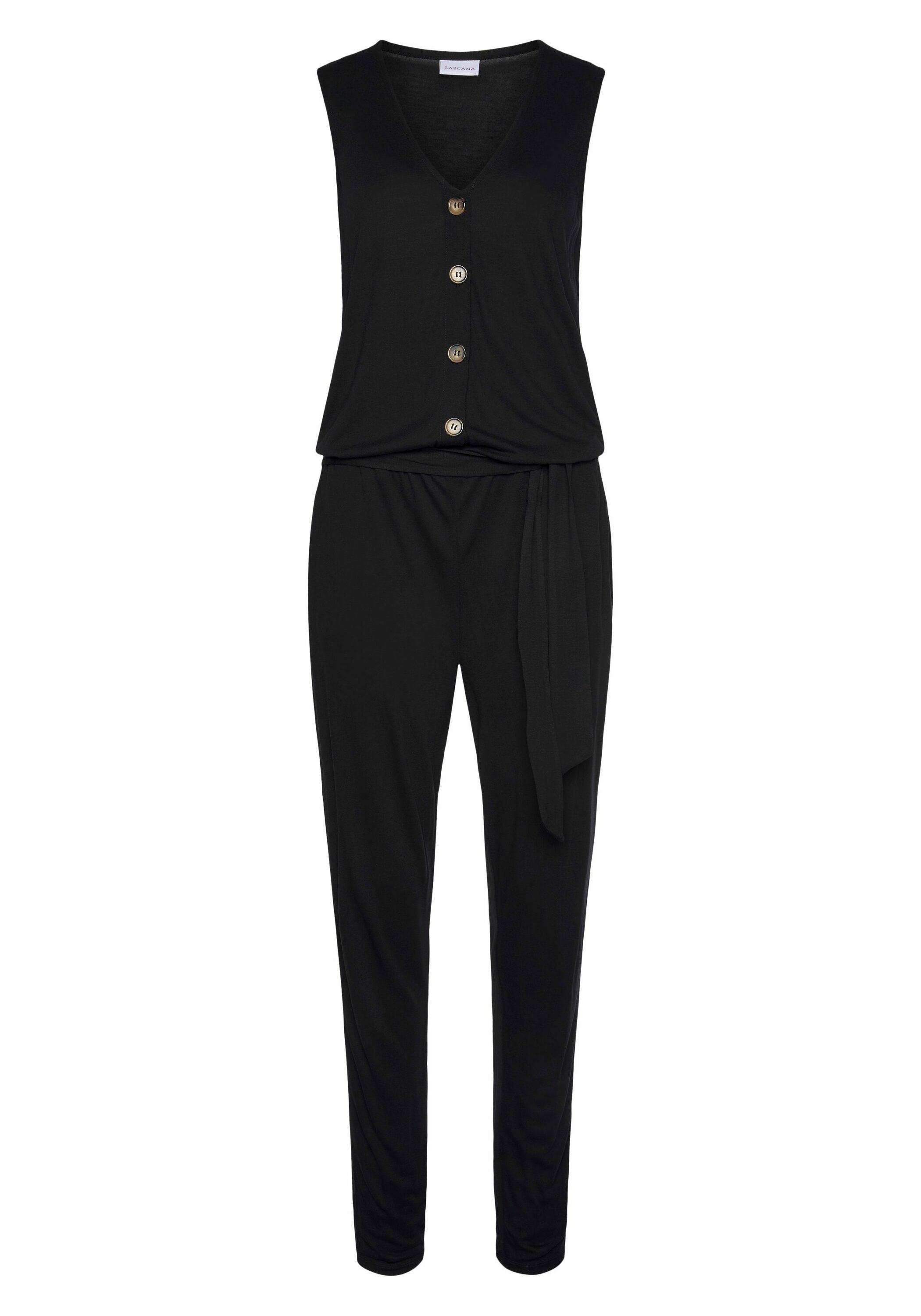 Overall von Lascana in ärmelloser Form mit V-Ausschnitt und Knopfleiste vorn, seitliche Eingrifftaschen. Gummizug und Bindegürtel in der Taille. Innenbeinlänge ca. 72 cm. Aus 100% Viskose.