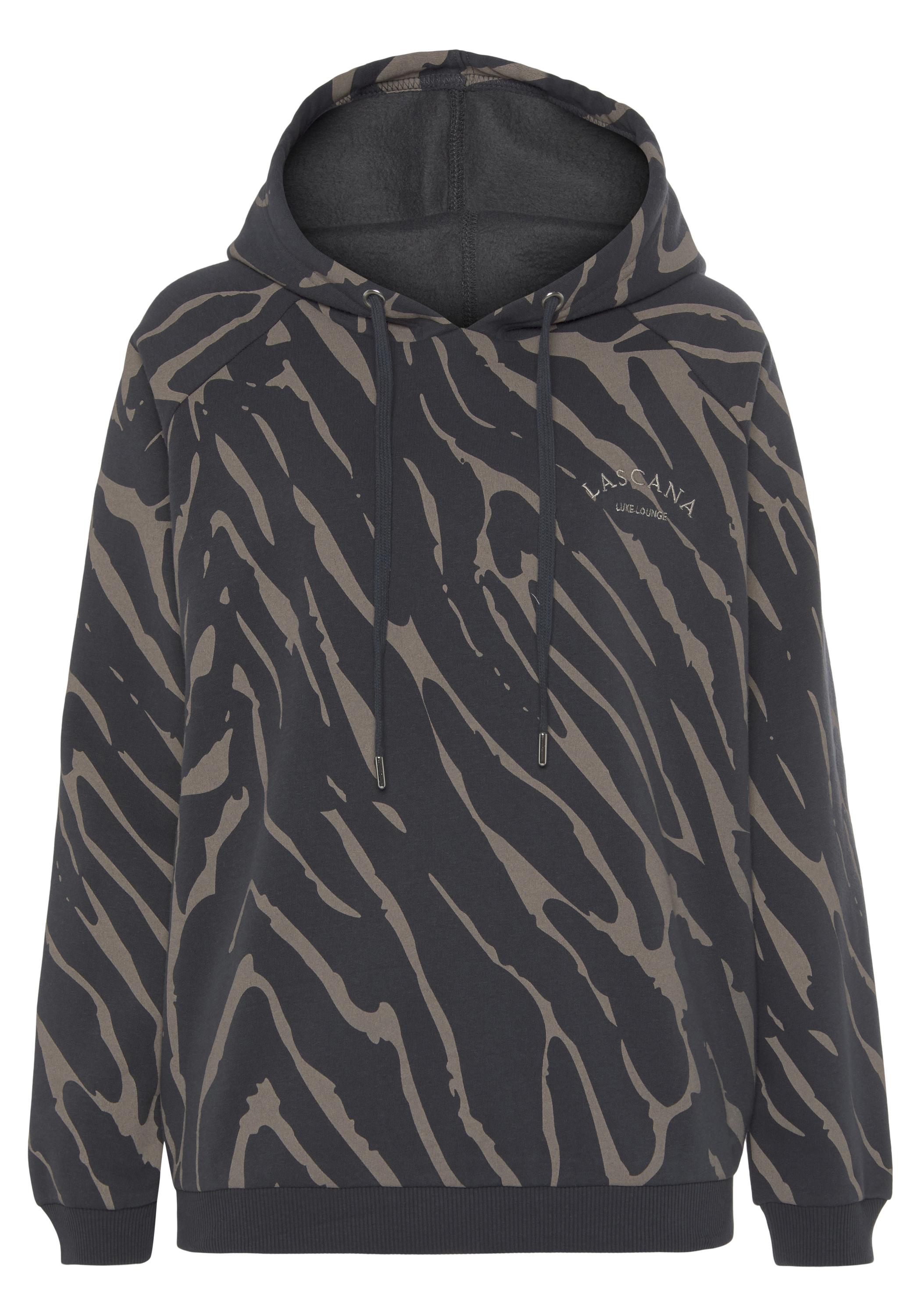 Kapuzensweatshirt von Lascana mit Allover-Zebramuster. Raglanärmel. Rippbündchen. Kapuze mit Tunnelzug. Logostickerei auf der Brust. Weiche Sweatqualität.