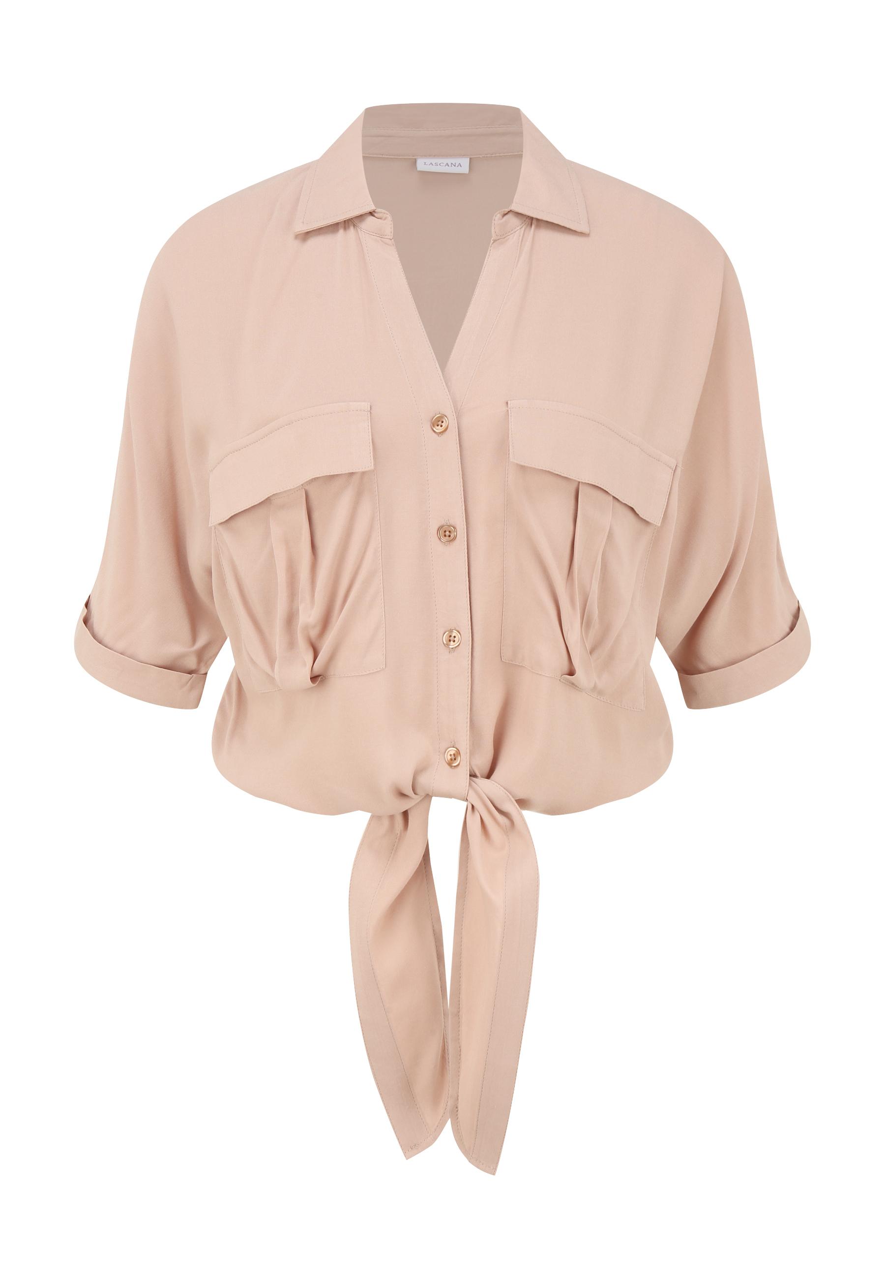 Bluse von Lascana mit Zipfeln vorn am Saum zum Knoten. Durchgehende Knopfleiste. 2 Pattentaschen auf der Brust. Weite, 3/4-lange Ärmel. Länge ca. 50 cm. Aus 100% gewebter Viskose.