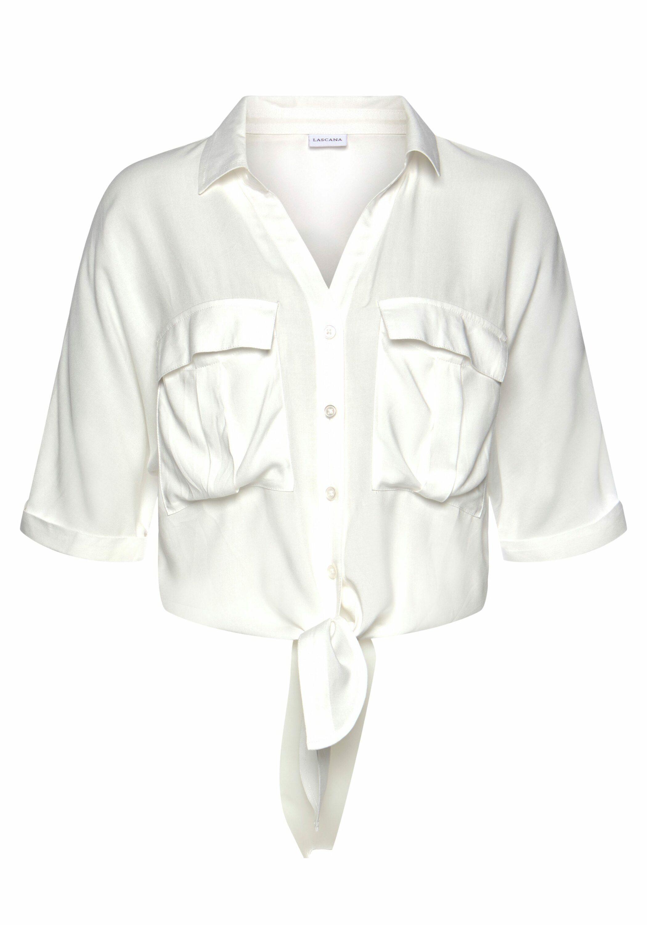 Bluse von Lascana mit Zipfeln vorn am Saum zum Knoten. Durchgehende Knopfleiste. 2 Pattentaschen auf der Brust. Weite, 3/4-lange Ärmel. Länge ca. 50 cm. Aus 100% gewebter Viskose.
