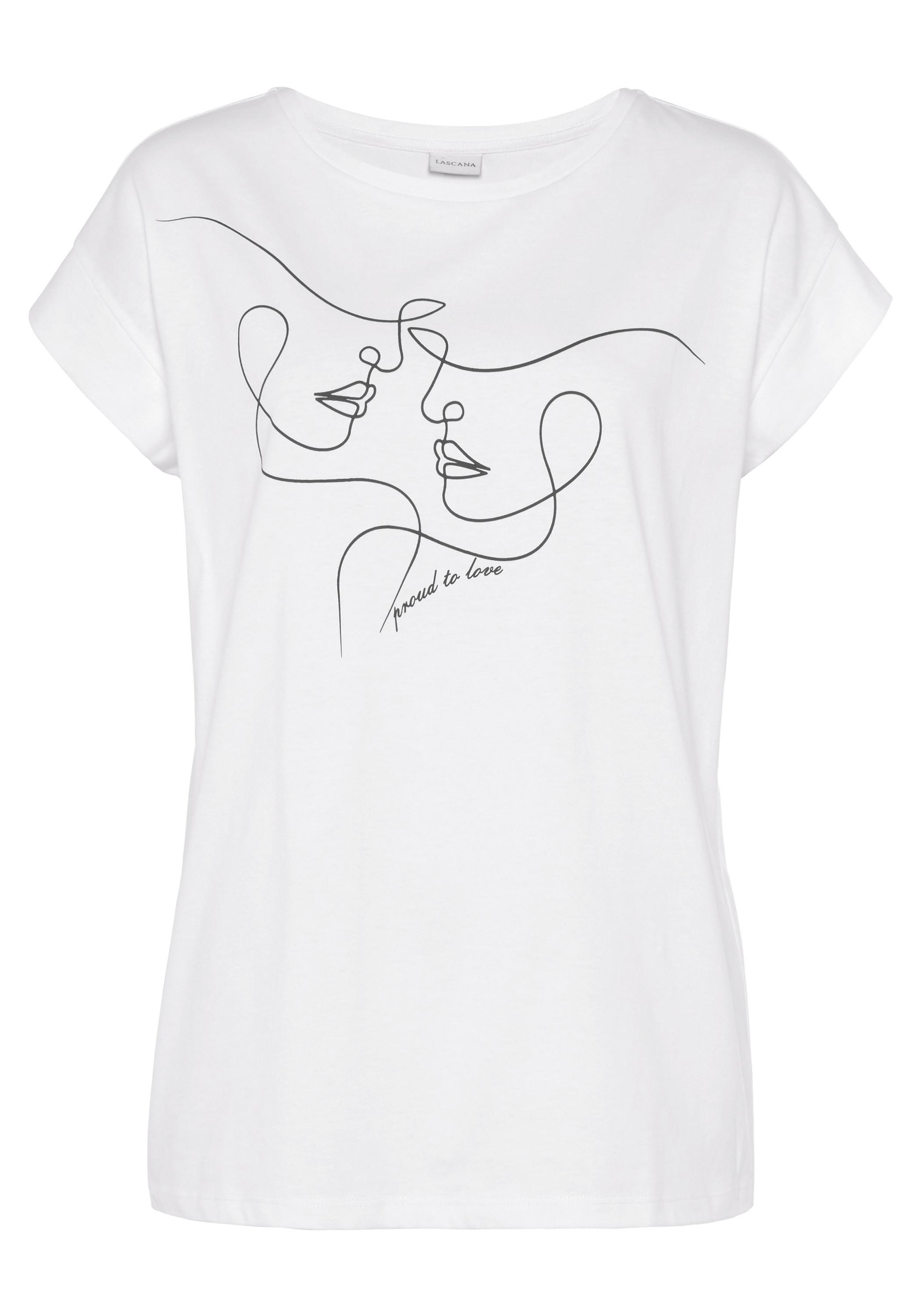 T-Shirt von Lascana mit Frontprint. Rundhalsausschnitt und kurze Ärmel. Gerade Passform mit geradem Saumabschluss. Angenehme Jerseyware aus Baumwolle.