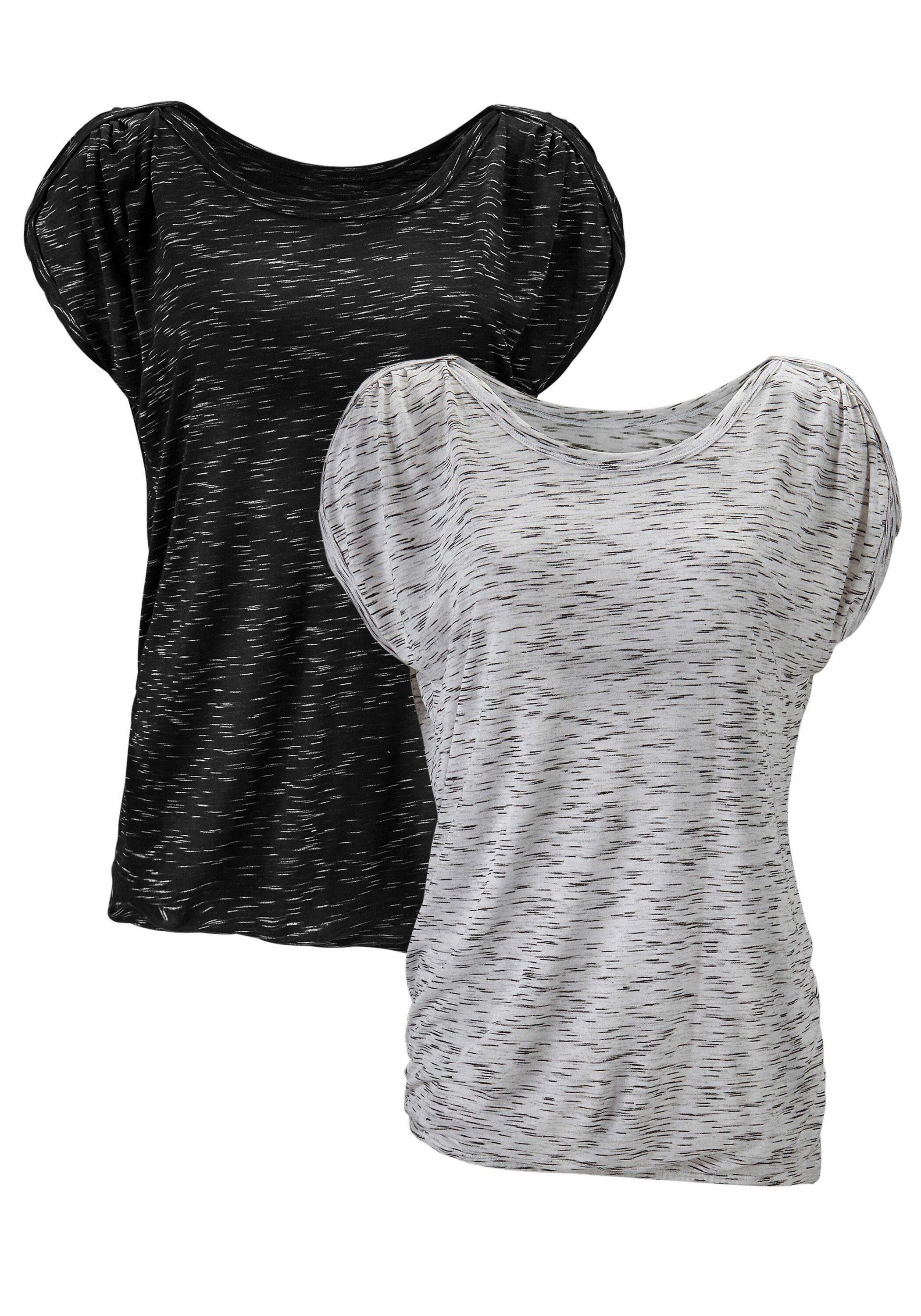 2er-Pack melierte T-Shirts von Lascana mit aufwendiger Schulterraffung. Legere Passform durch Gummizug am Bund. Aus weich fließender Qualität mit hohem Viskoseanteil.