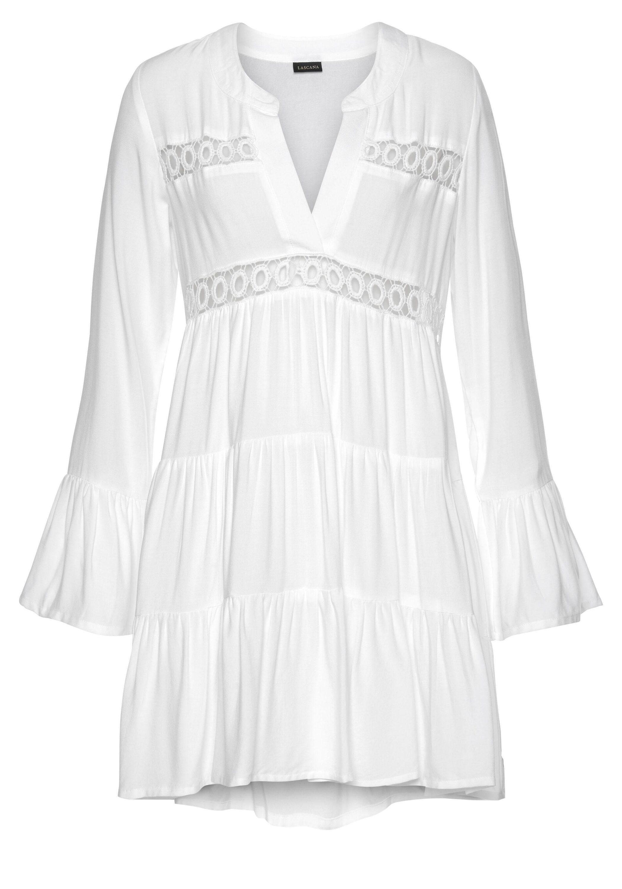 In schwingender A-Linie mit eingesetztem Spitzenband ober- und unterhalb der Brust. Lange Ärmel mit Volantabschluss. Zum Saum hin weit ausgestellt und abgestuft. Länge ca. 86 cm. Aus 100% gewebter Viskose.