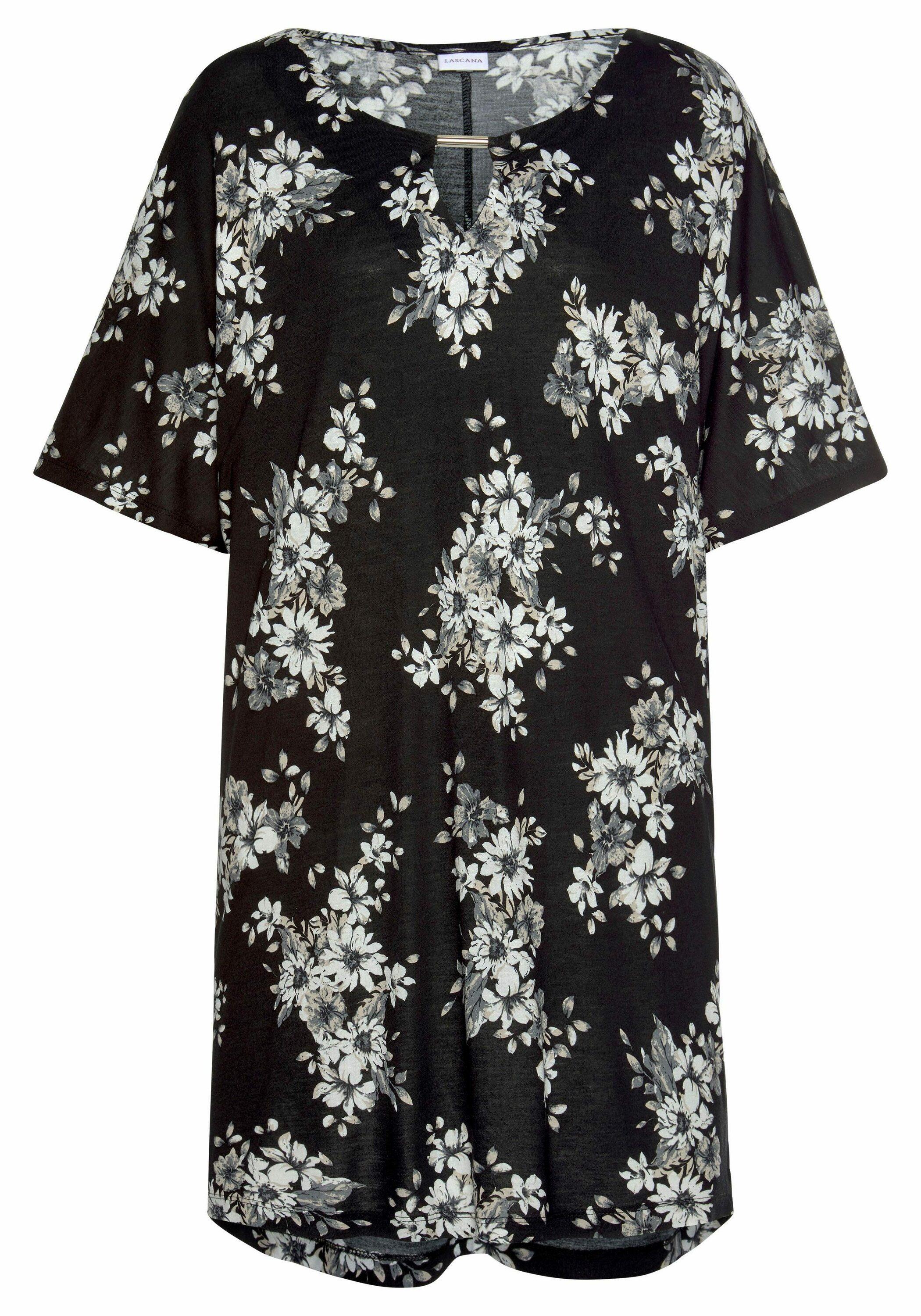 Longshirt von LASCANA. Kann als Minikleid oder über einer Leggings getragen werden. Vorn am Ausschnitt mit goldenfarbenem Accessoire. Weite, kurze Ärmel. Länge ca. 86 cm. Aus 100% Viskose.