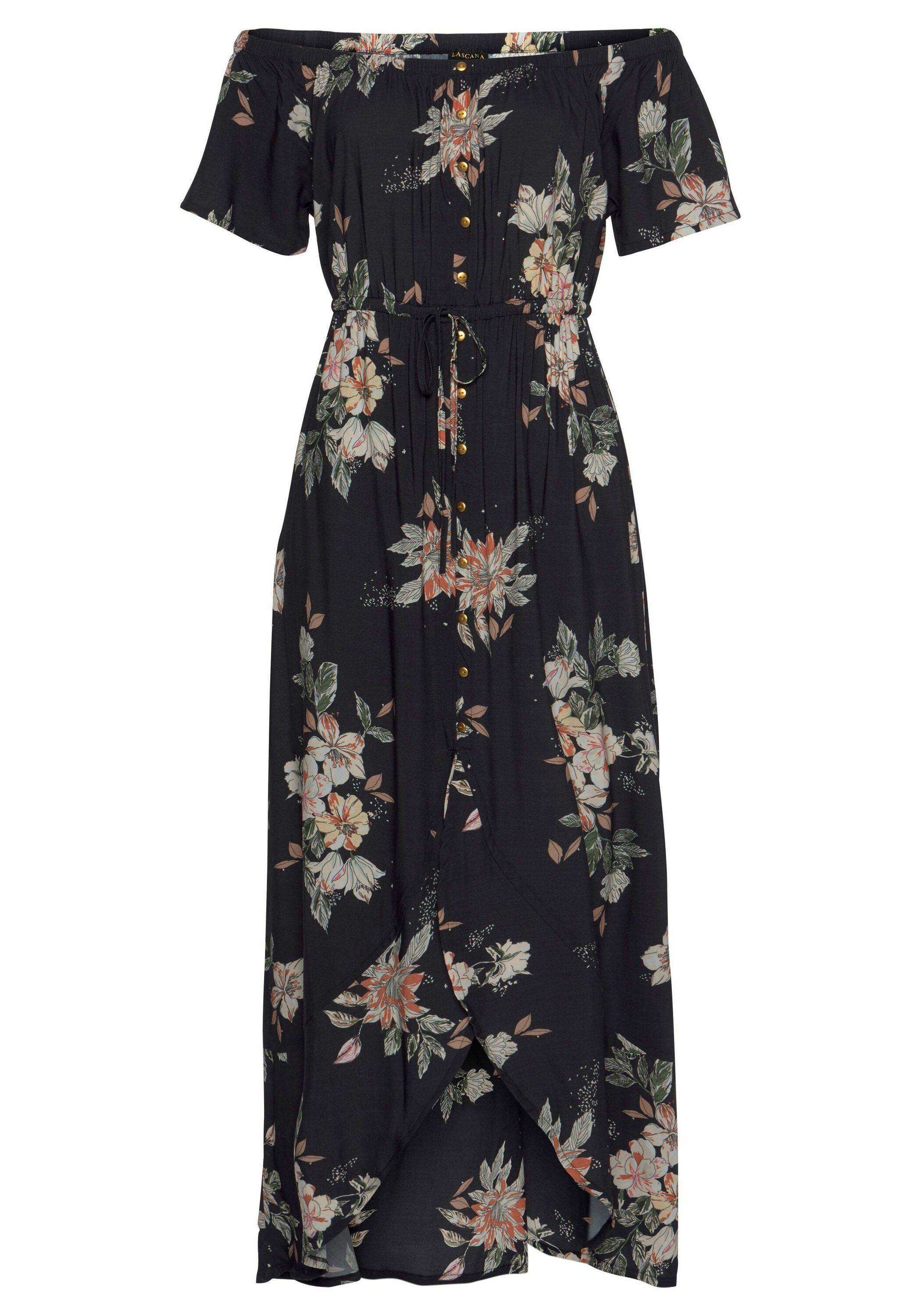 Der weite Carmenausschnitt mit Gummizug und Volant kann normal auf den Schultern oder schulterfrei getragen werden. Zierknopfleiste vorn. Gummizug in der Taille. Weites Rockteil, hinten länge als vorn. In uni Schwarz oder mit Alloverdruck, jedes Teil ein Unikat. Rückenlänge ca. 124 cm. Aus 100% gewebter Viskose.