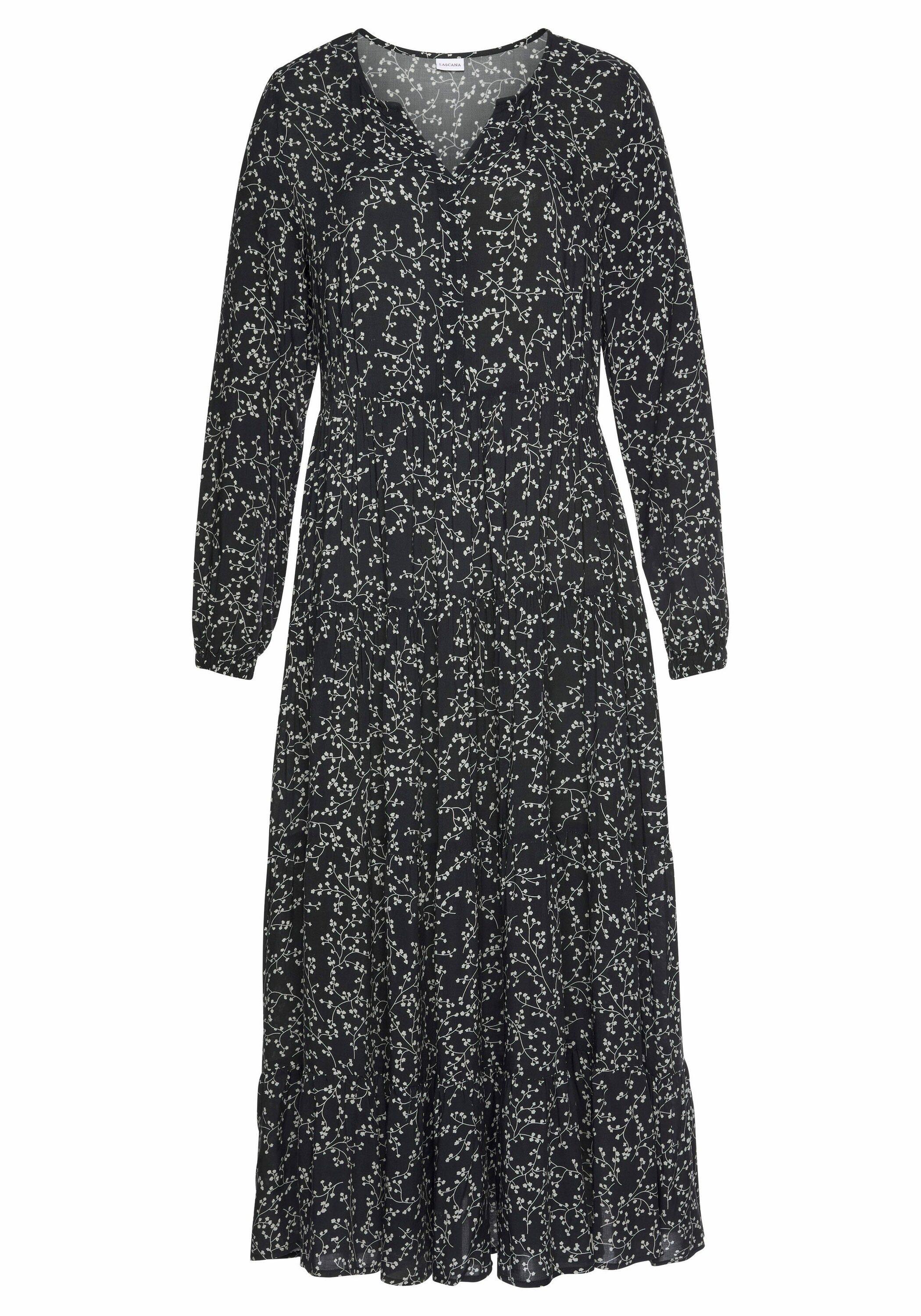 Maxikleid mit Blumenprint allover, jedes Teil ein Unikat. Lange Ärmel mit Gummizug. Langer, schwingender Rockpart. Länge ca. 128 cm. Weiche, gewebte Qualität aus 100% Viskose.