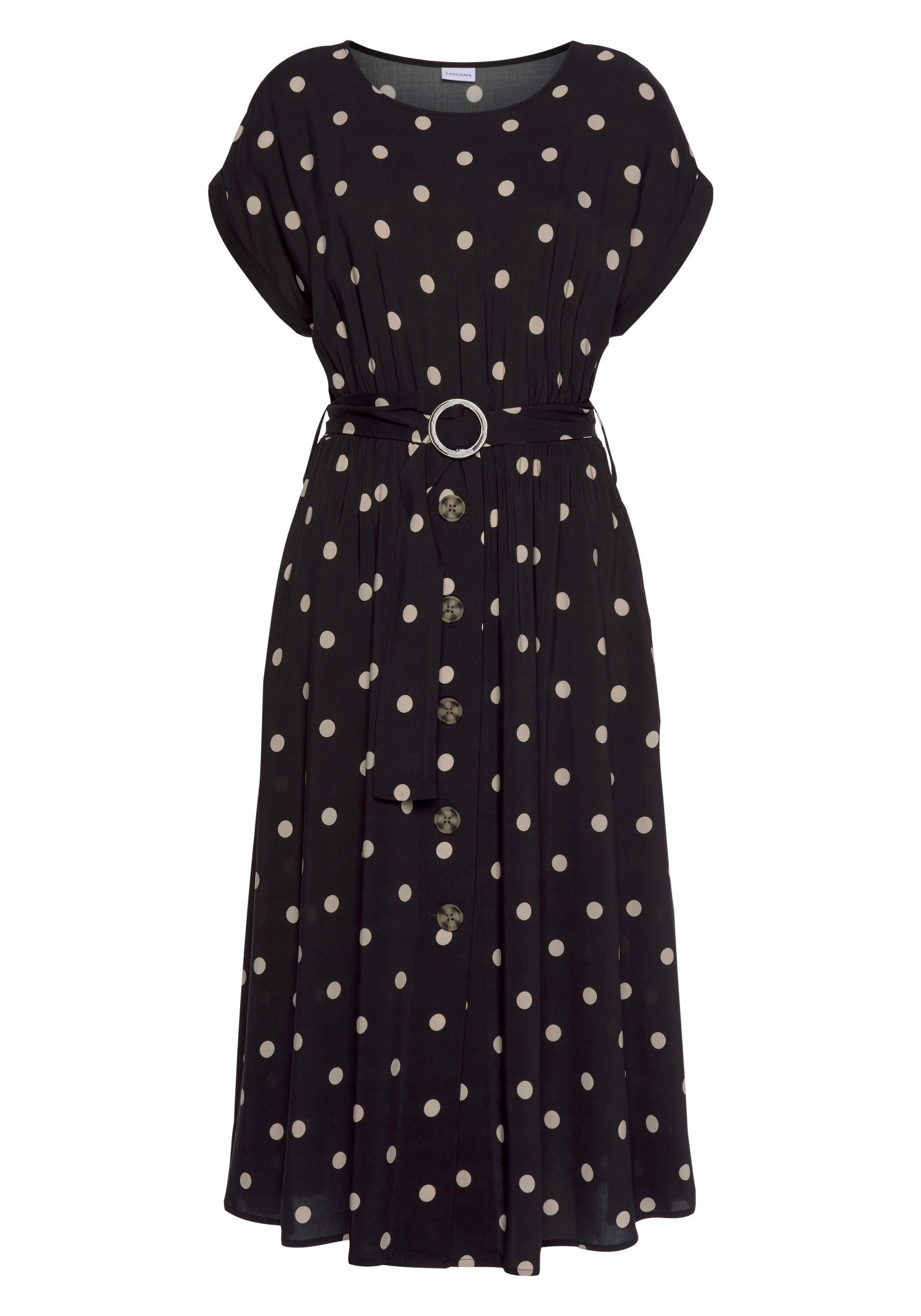 Kleid von Lascana im Tupfen-Design. Kurze Ärmel mit Umschlag. Passender Gürtel in der Taille. Rockpart mit Knopfleiste und seitlichen Eingrifftaschen. Gewebte Qualität aus Viskose.