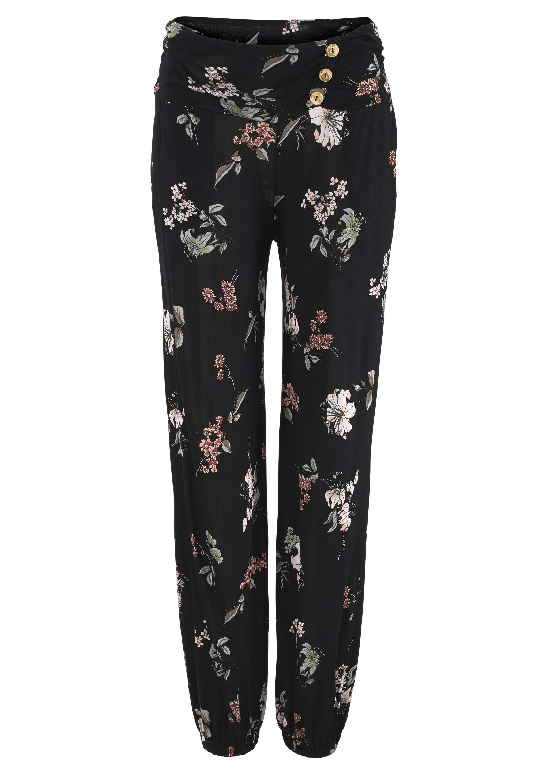 Schlupfhose mit extrabreitem Bund. Geprägte Holz-Zierknöpfe. Mit seitlichen Eingrifftaschen. Gummizug am Beinabschluss. Allover bedruckt, jedes Teil ein Unikat. Aus Viskosejersey.