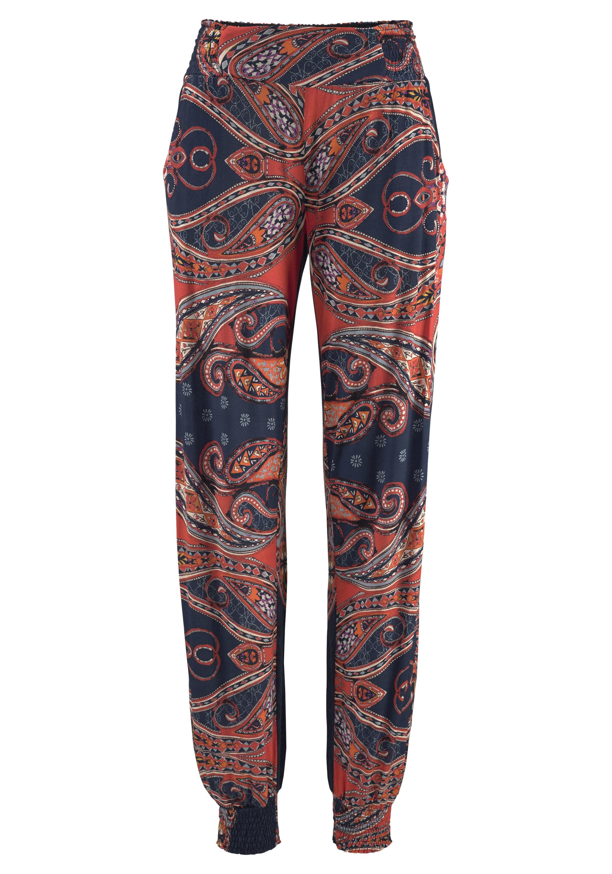 Strandhose im Paisley-Design. Smokeinsätze hinten am Bund und unten am Beinabschluss. Seitliche Eingrifftaschen. Innenbeinlänge ca. 80 cm. Aus 100% Viskose.