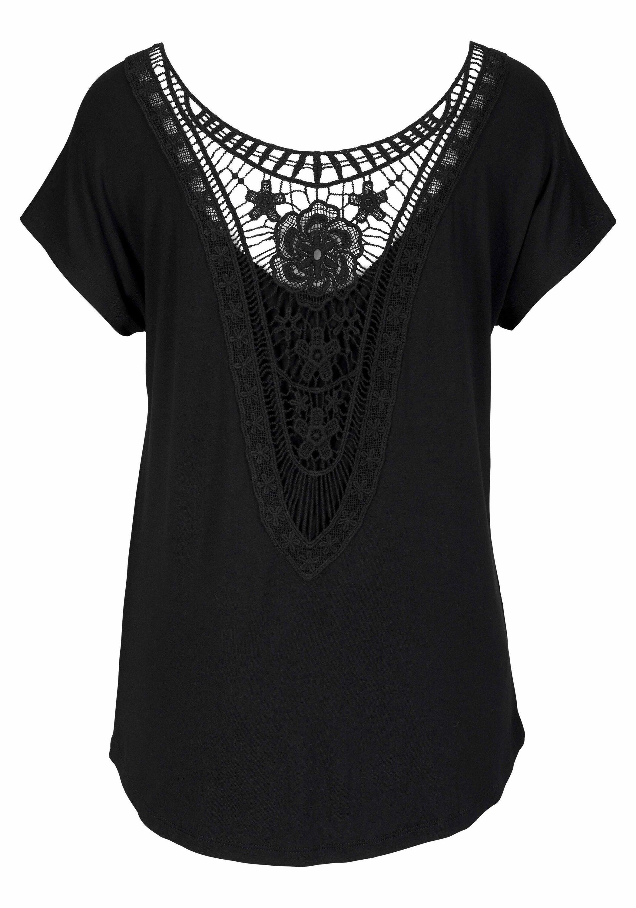 Shirt von LASCANA mit aufwendigem Häkeleinsatz hinten. Vorn mit rundem Ausschnitt. Kurze, angeschnittene Ärmel. Länge ca. 68 cm. Aus 95% Viskose, 5% Elasthan. Spitze: 100% Baumwolle.